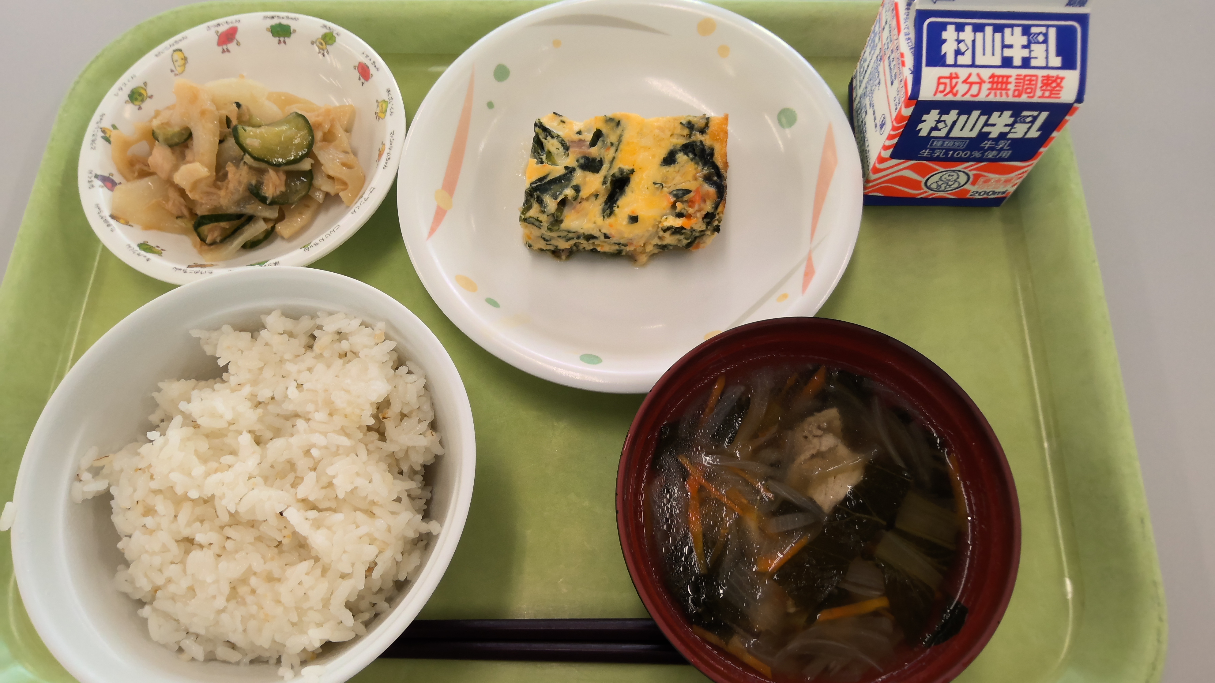 献立名:麦ごはん、牛乳、キッシュ風たまごのオーブン焼き、れんこんと大根のサラダ、チンゲンサイのスープ