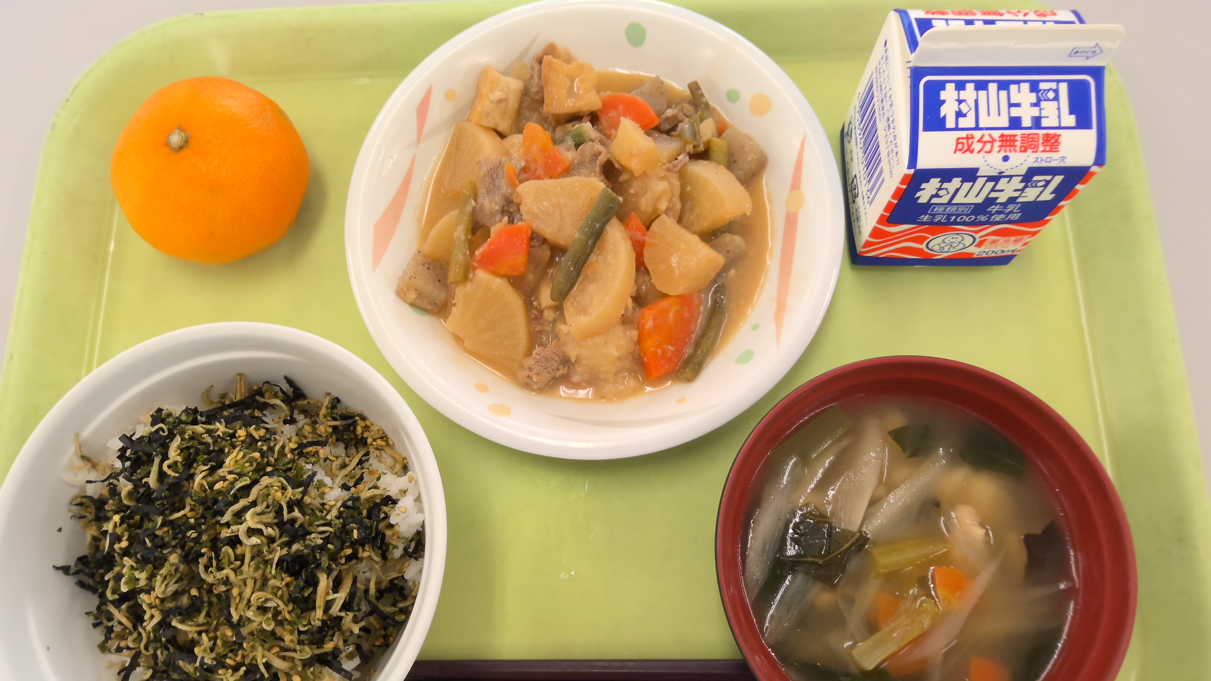 献立名:麦ごはん、牛乳、みそ煮、だご汁、嬉野茶手作りふりかけ、くだもの(みかん)
