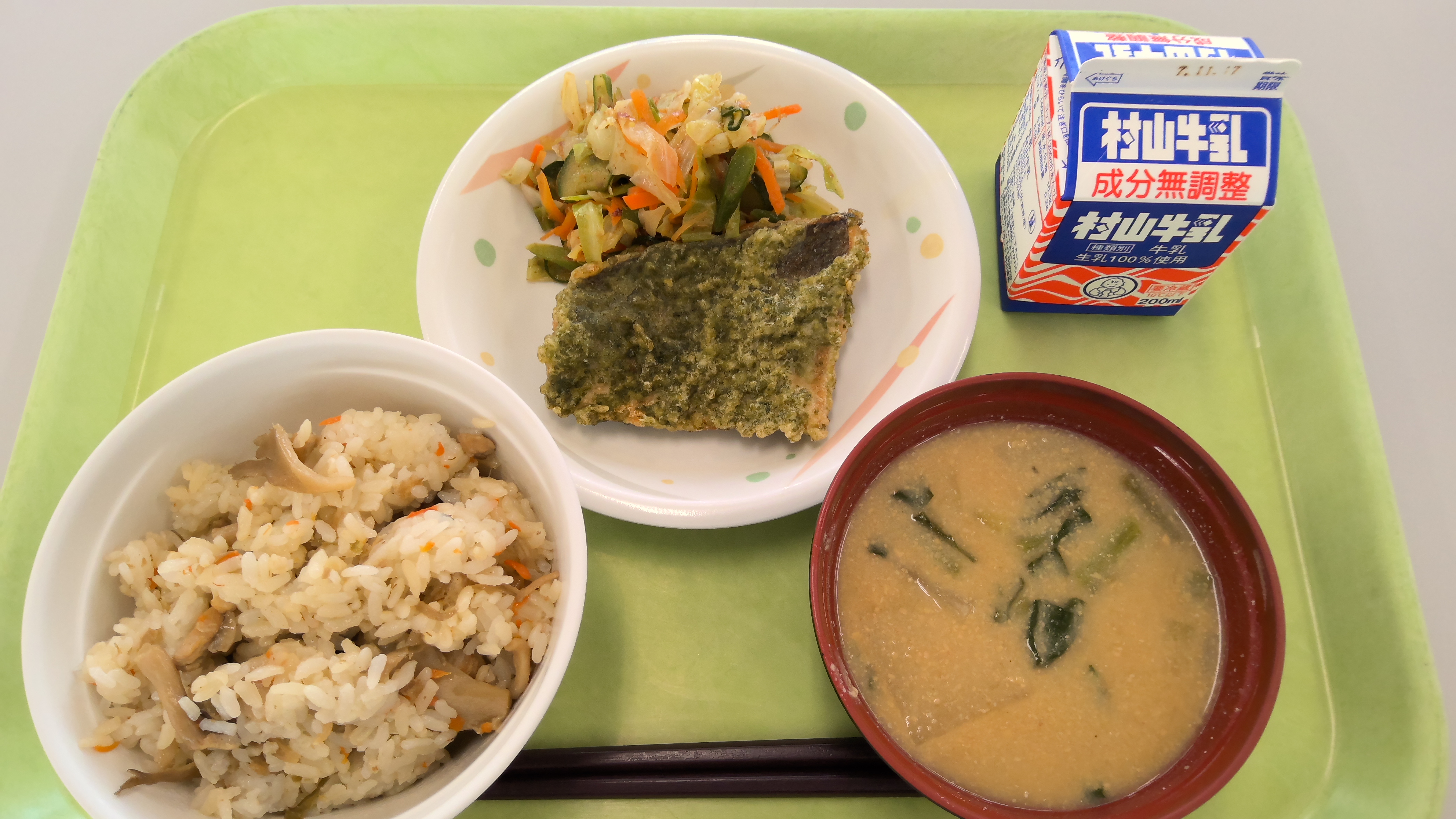 献立名:きのこごはん、牛乳、あじの磯辺揚げ、梅おかかあえ、呉汁