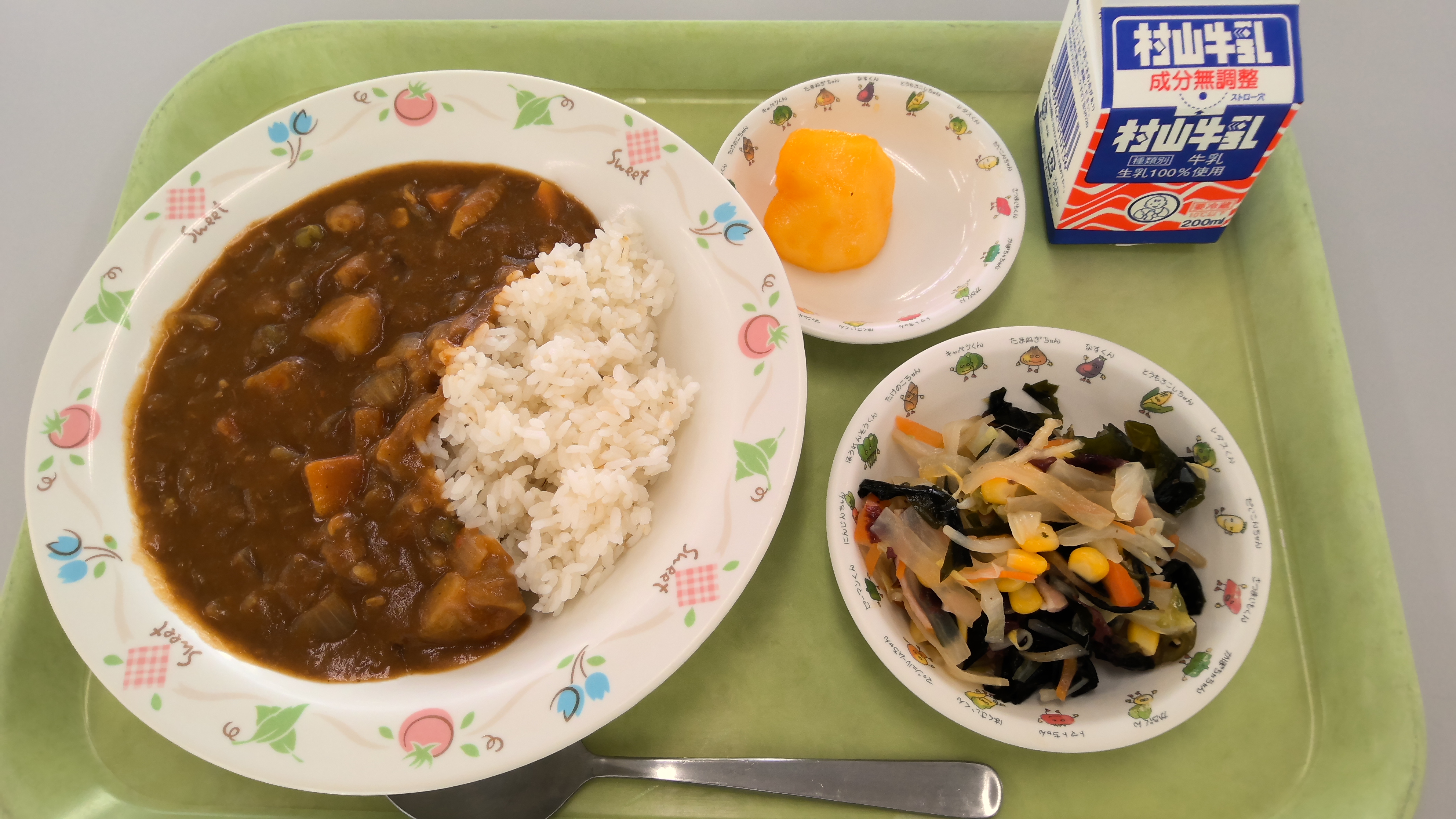 献立名:シーフードカレー、牛乳、海藻サラダ、くだもの(柿)