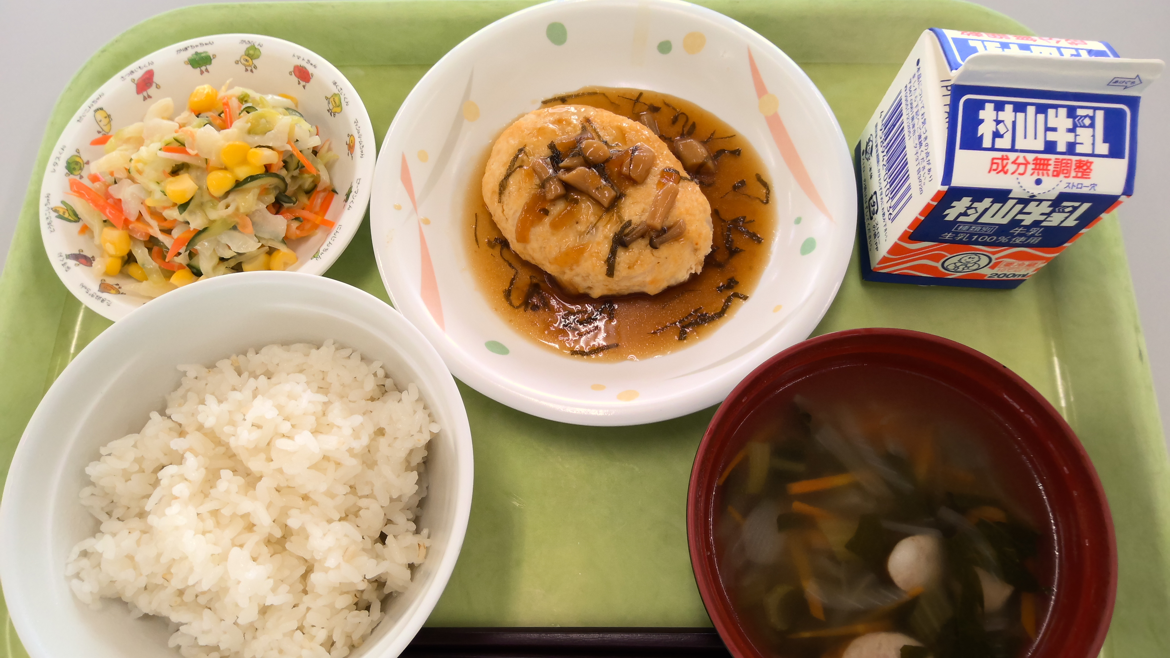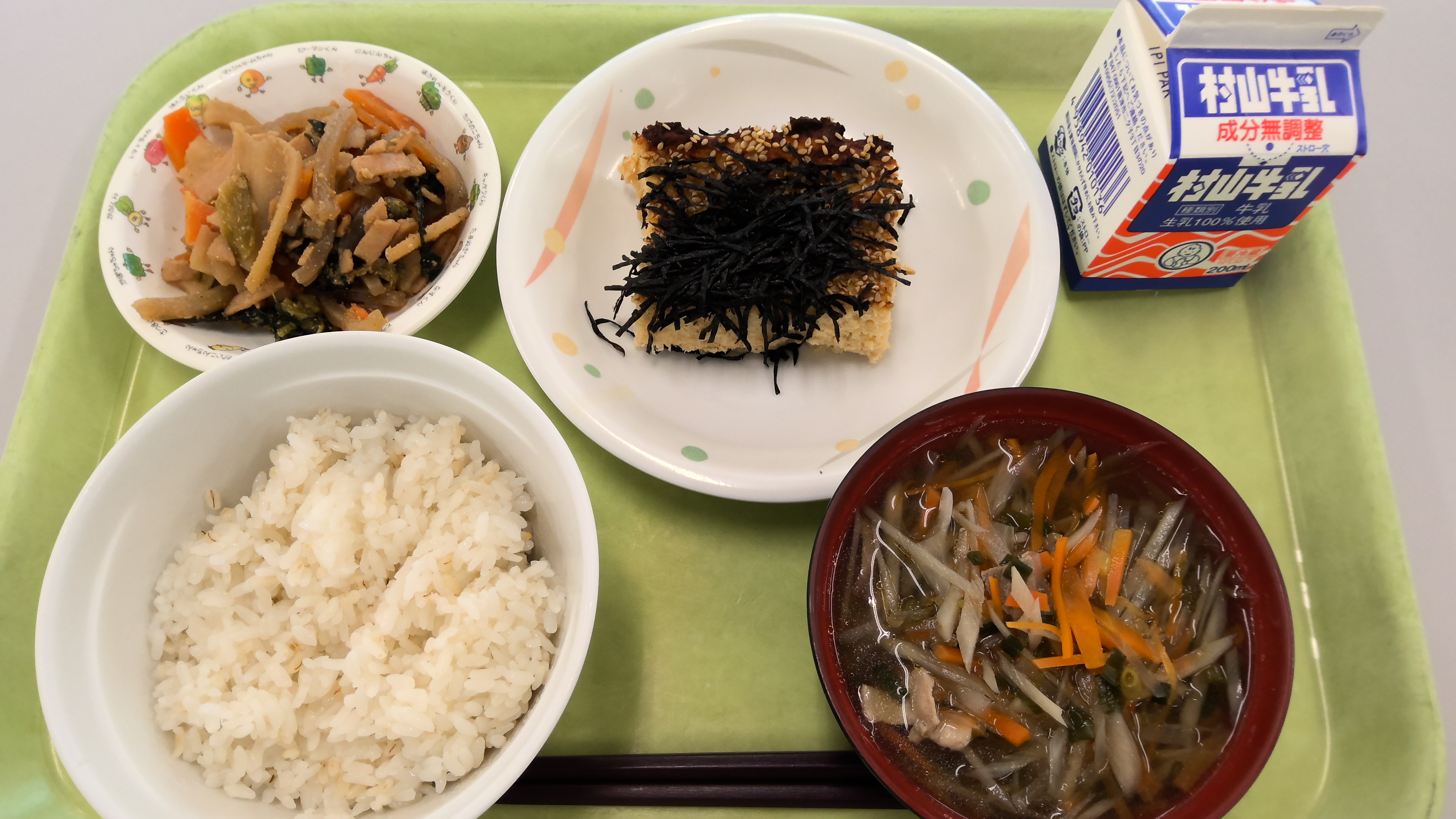 献立名:麦ごはん、牛乳、松風焼き、こんにゃくと野菜の炒め物、沢煮椀