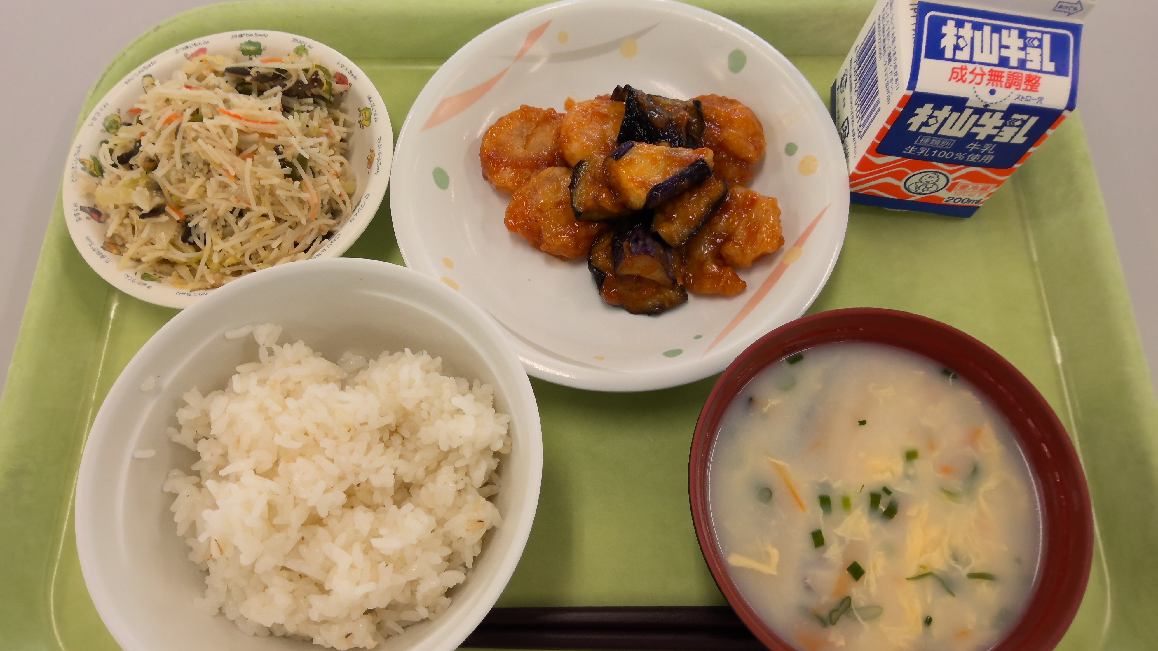 献立名:麦ごはん、牛乳、えびとなすのチリソース炒め、炒めビーフン、五目スープ