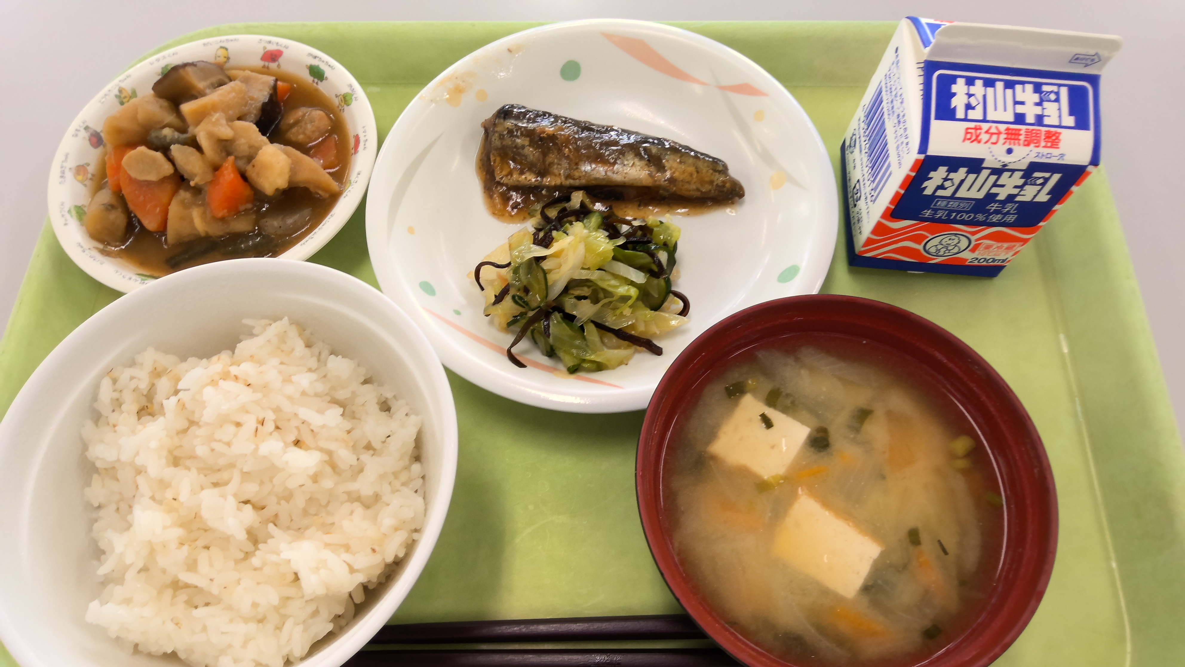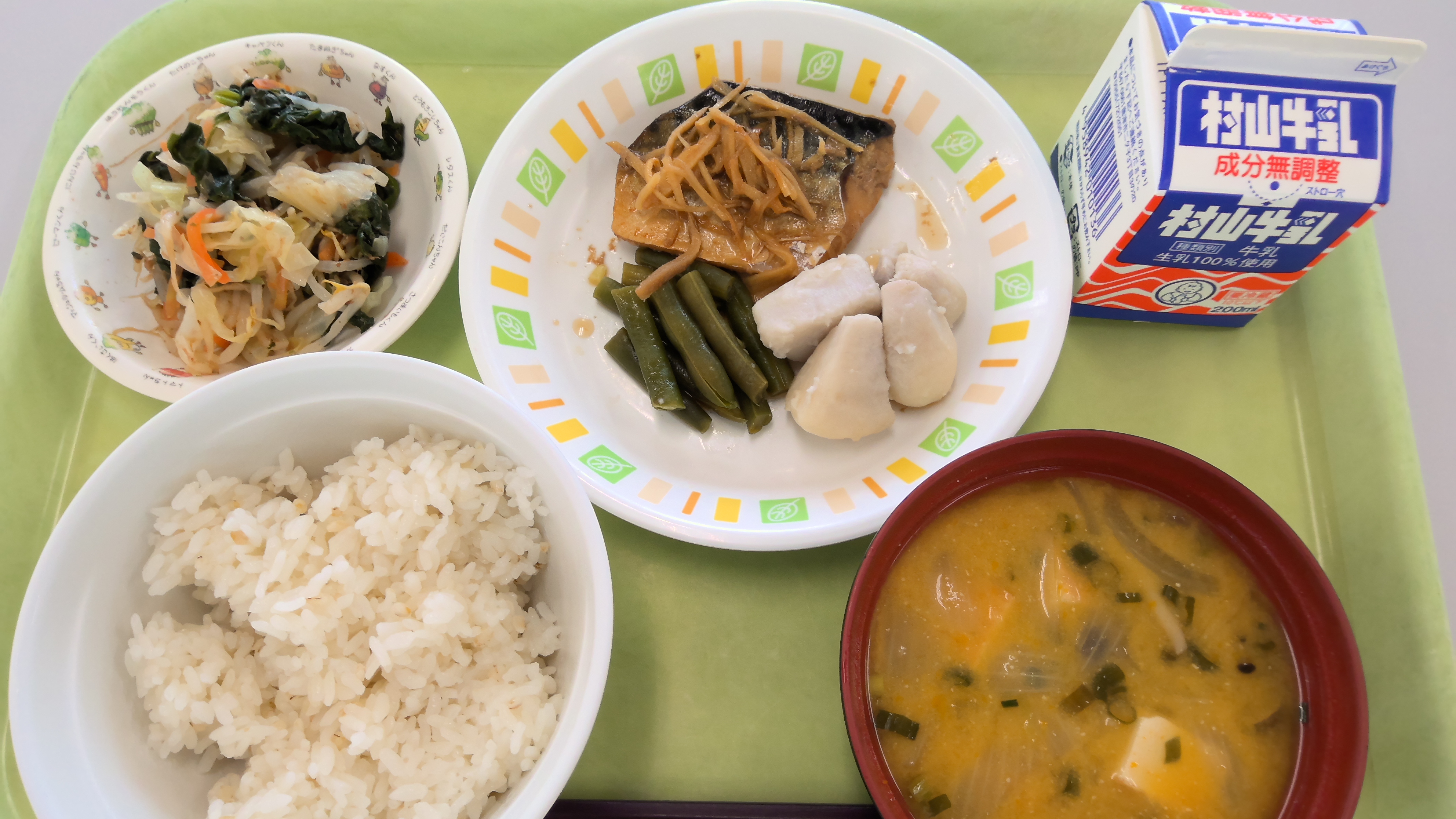 献立名:麦ごはん、牛乳、さばの煮付け・野菜の甘煮、おひたし、みそ汁