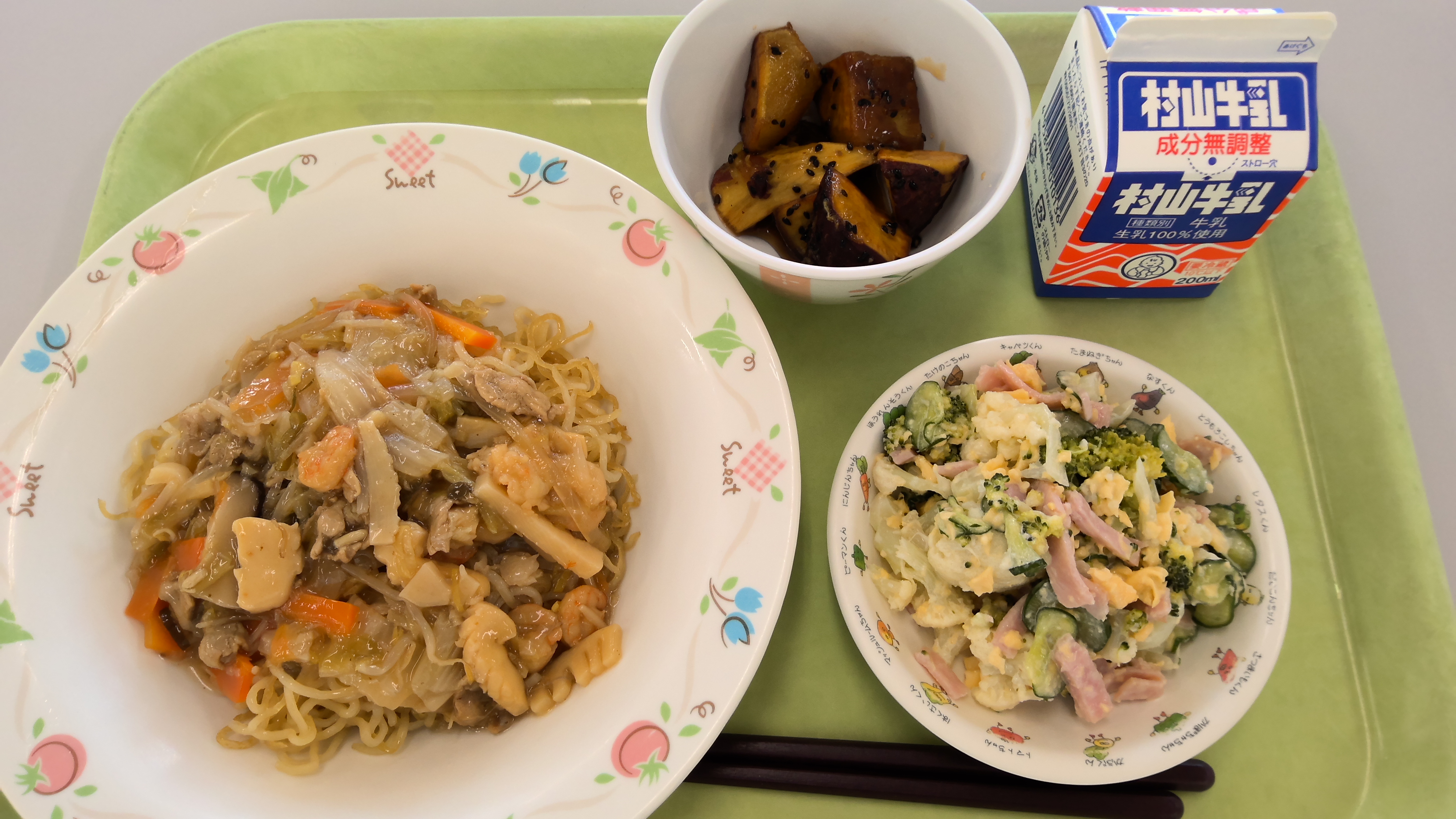 献立名:あんかけ焼きそば、牛乳、花野菜サラダ、大学芋