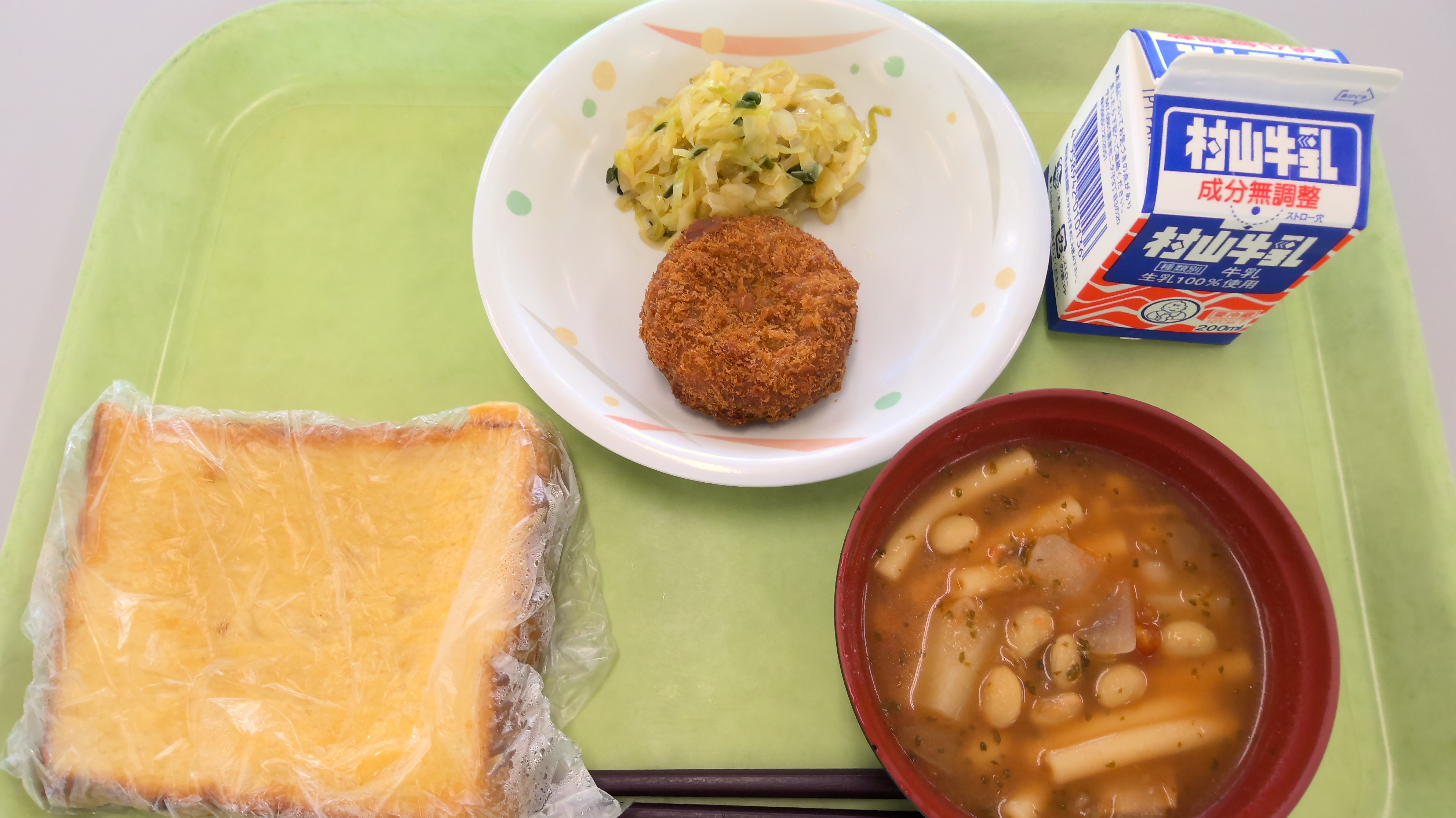 献立名:フレンチトースト、牛乳、かぼちゃとさつまいものコロッケ、ゆで野菜、ミネストローネ
