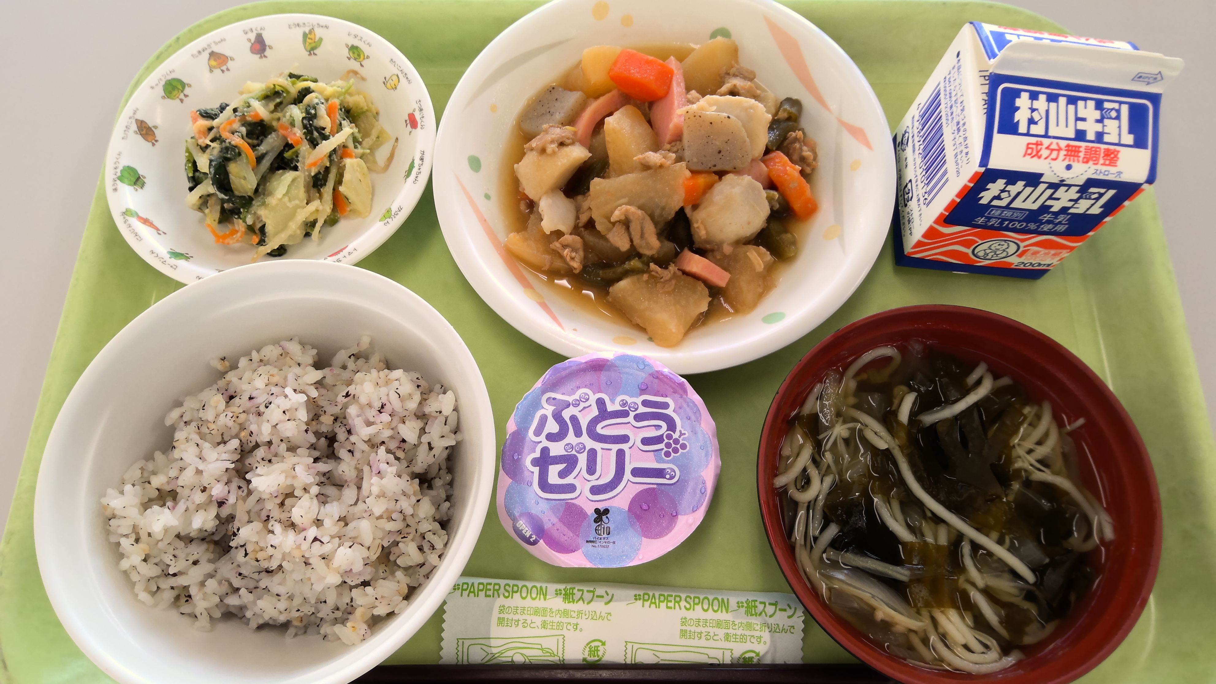 献立名:ゆかりごはん、牛乳、豚肉と大根の煮物、アーモンドあえ、魚そうめん汁、ぶどうゼリー
