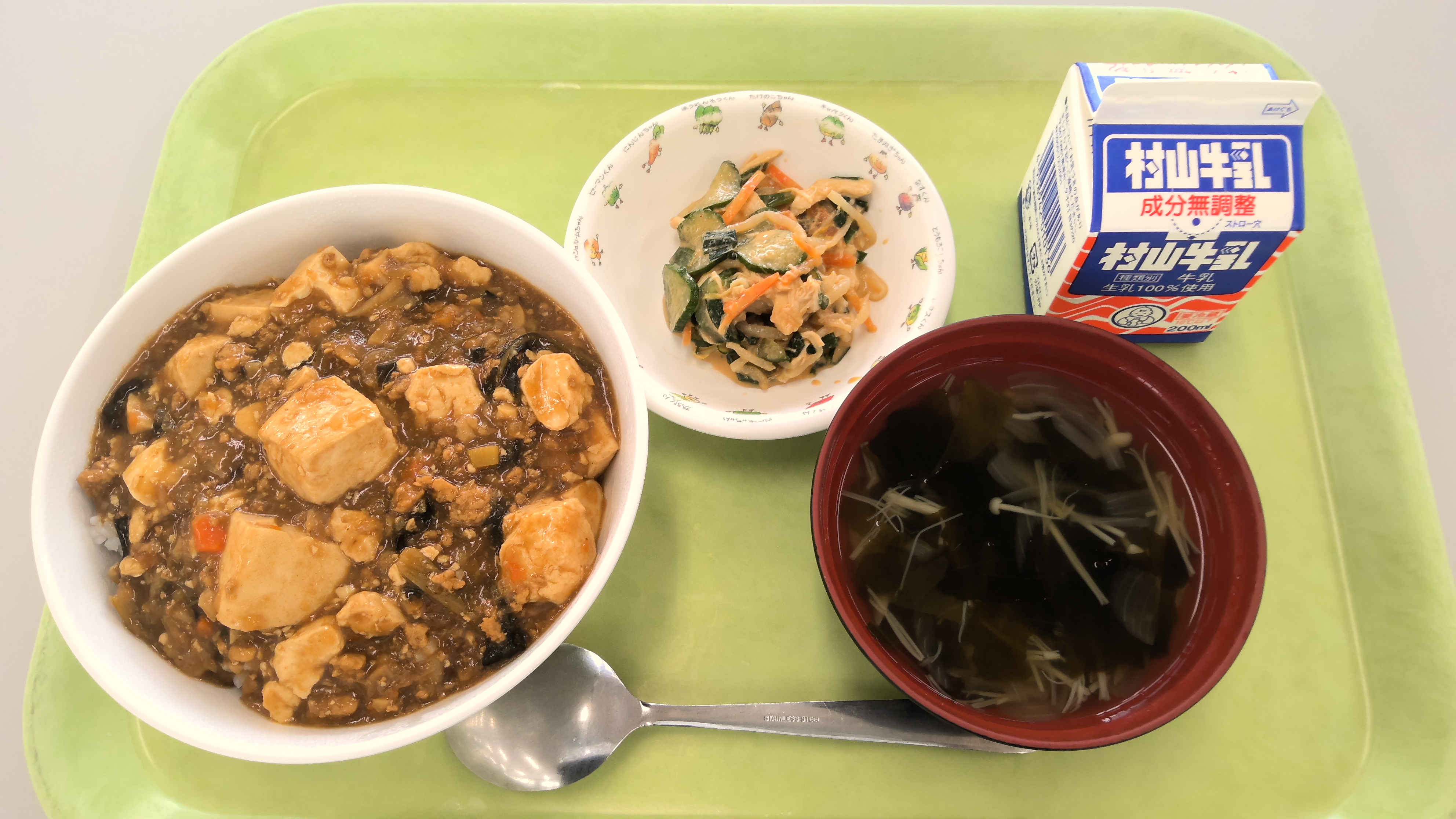 献立名:麻婆丼(伊万里産もち麦入りごはん)、牛乳、サラダビビンバ、わかめスープ