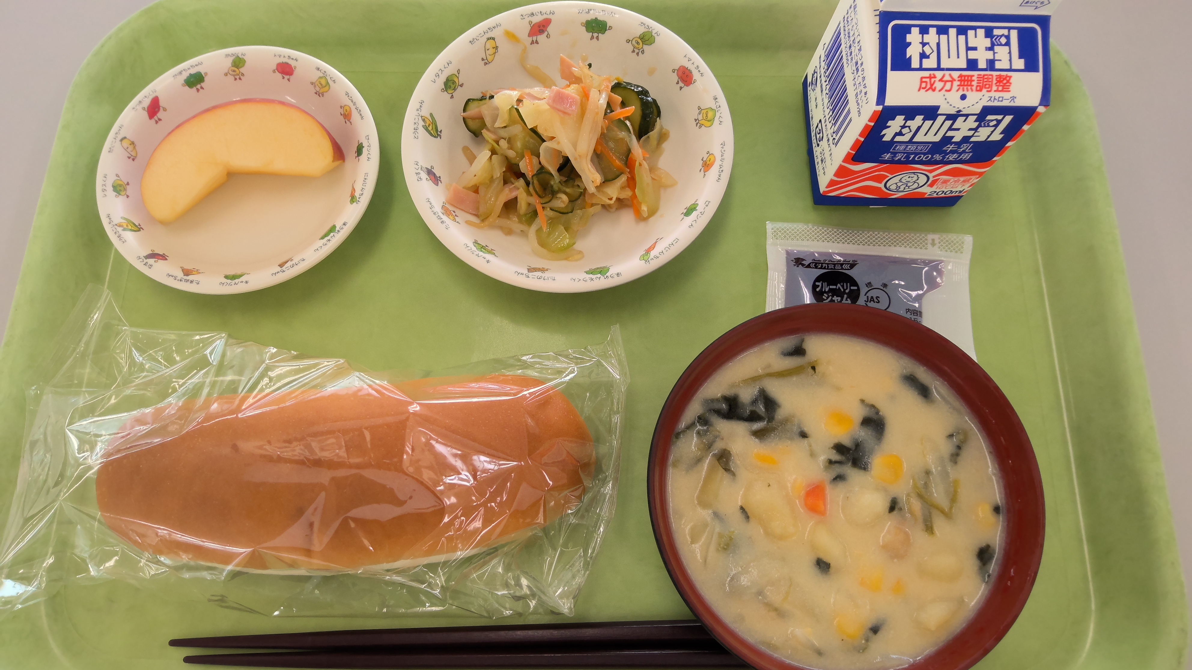 献立名:ミルクパン(ブルーベリージャム)、牛乳、手作りクリームシチュー、和風サラダ、くだもの(りんご)