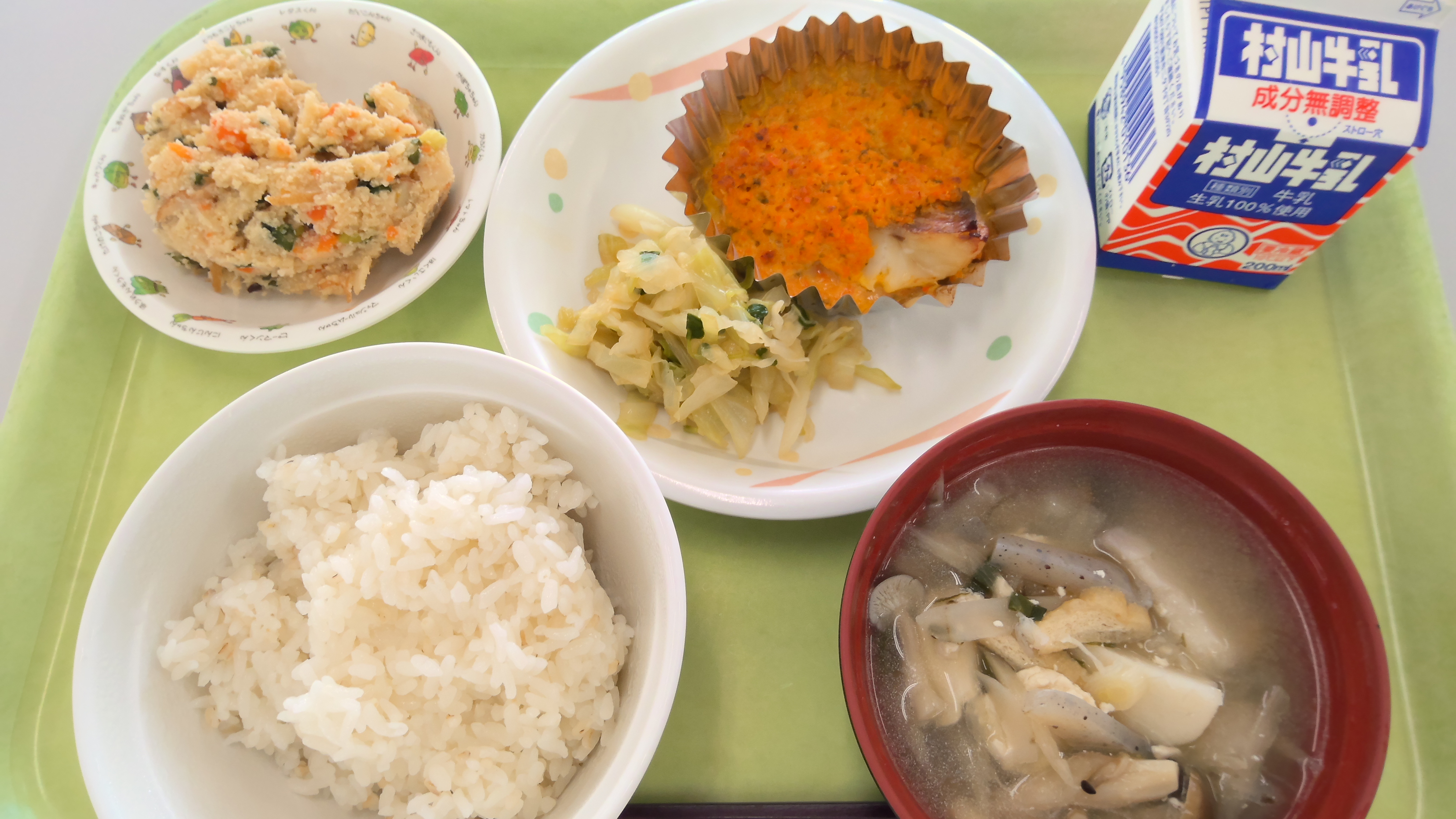 献立名:麦ごはん、牛乳、白身魚の紅葉焼き、おから炒め、けんちん汁