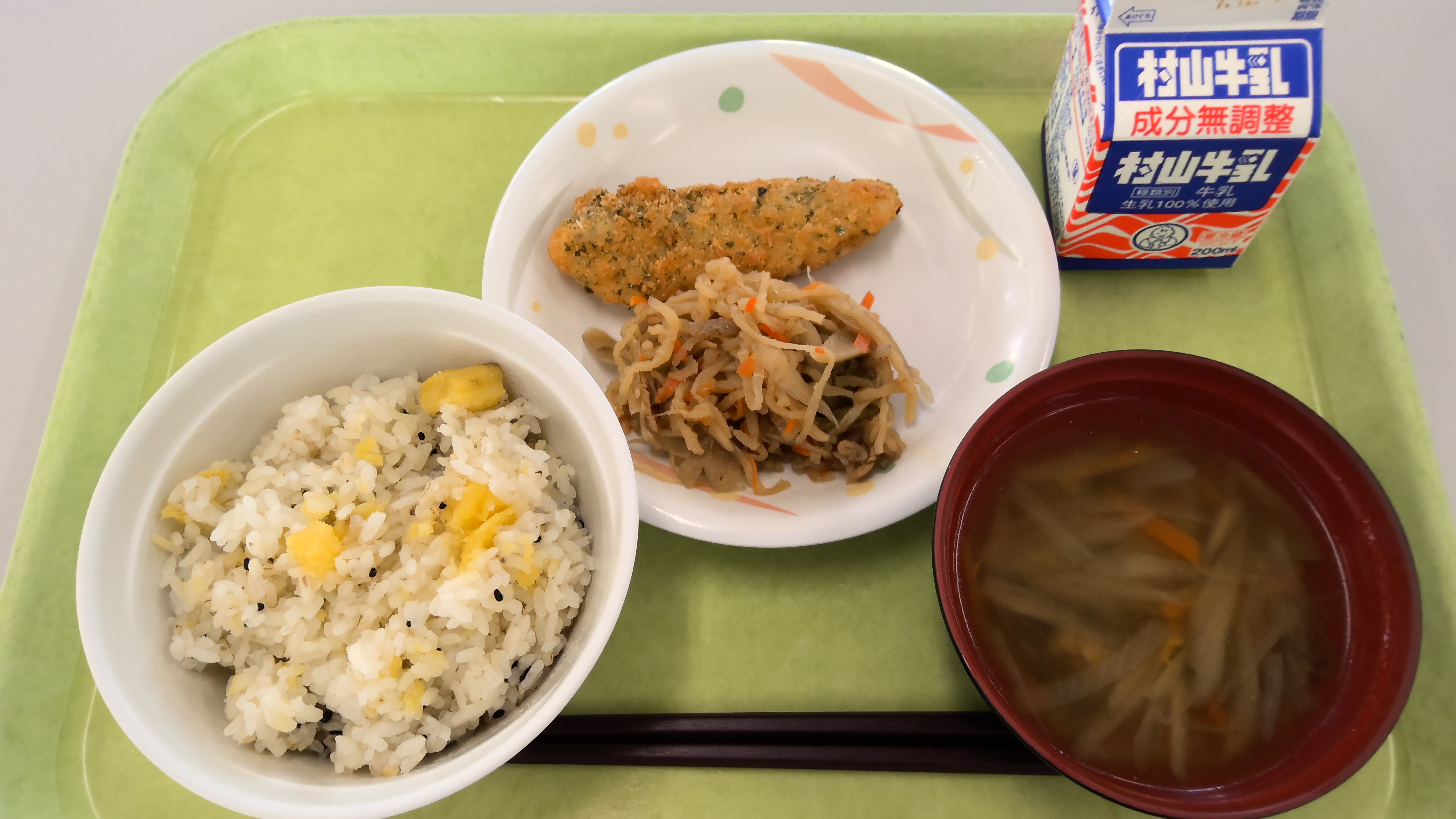 献立名:さつまいもごはん、牛乳、ホキフライ、切干大根の煮物、鶏肉とごぼうの柚こしょうスープ