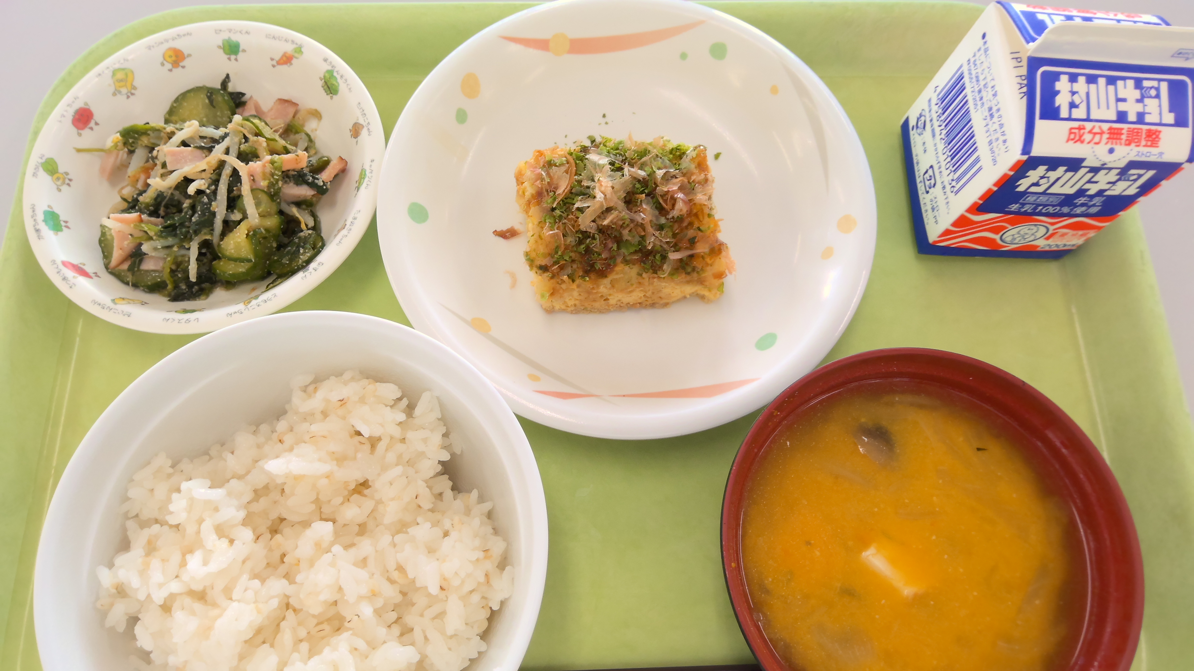 献立名:麦ごはん、牛乳、お好み焼き風たまご焼き、ほうれんそうのごまドレッシングあえ、みそ汁