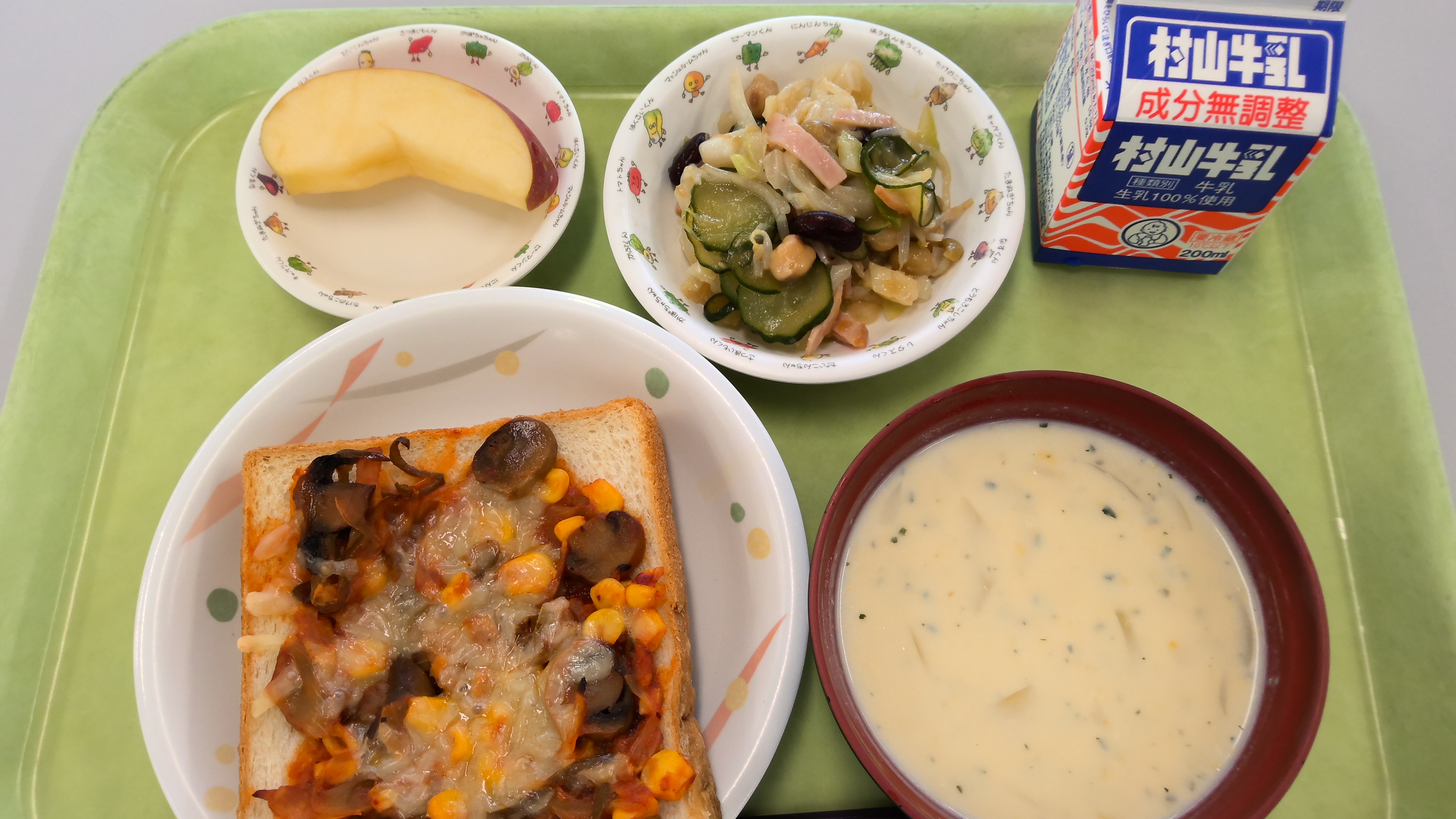 献立名:ピザトースト、牛乳、まめまめサラダ、コーンポタージュ、くだもの(りんご)