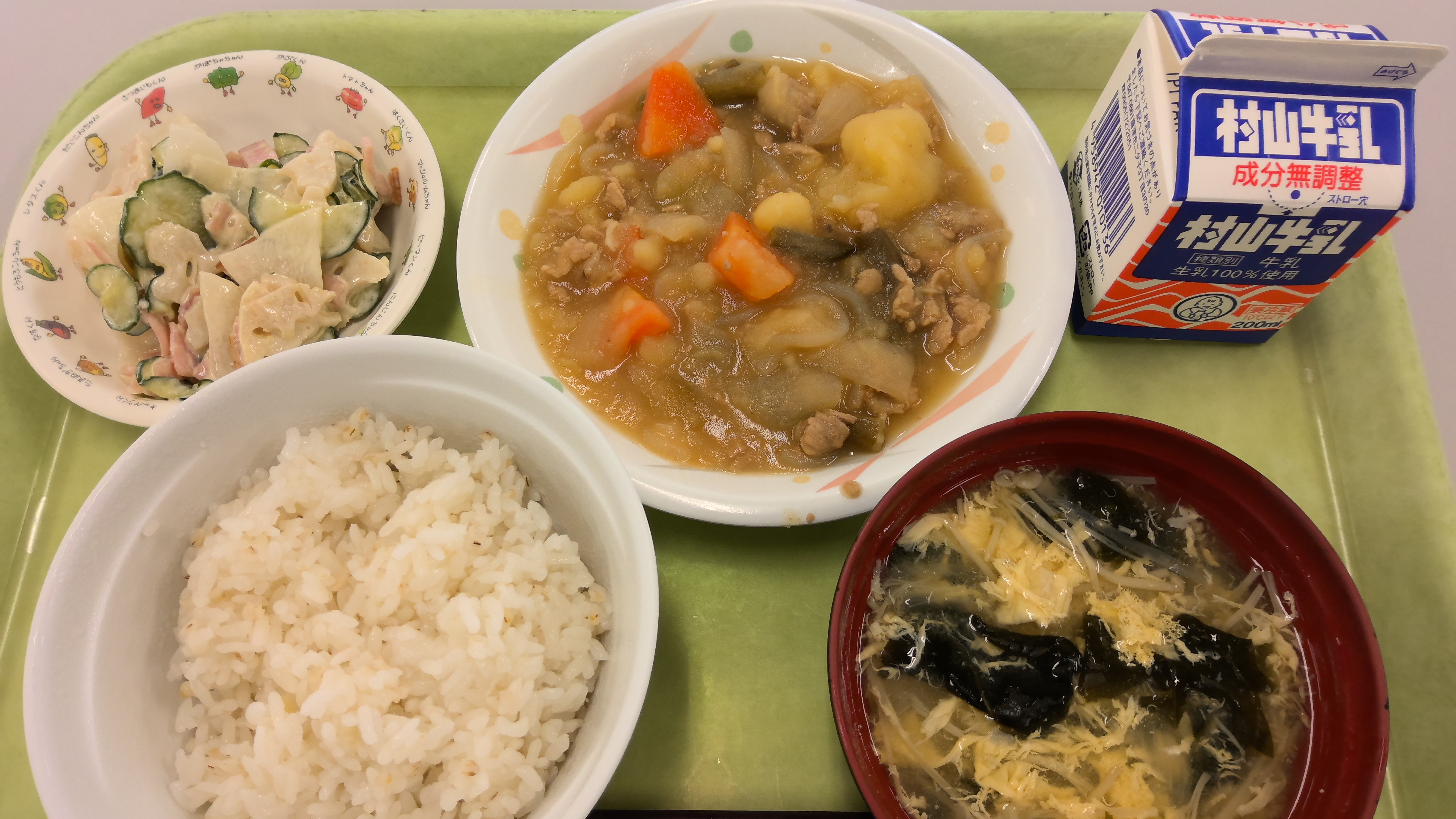 献立名:麦ごはん、牛乳、肉じゃが、れんこんのからしあえ、かきたま汁
