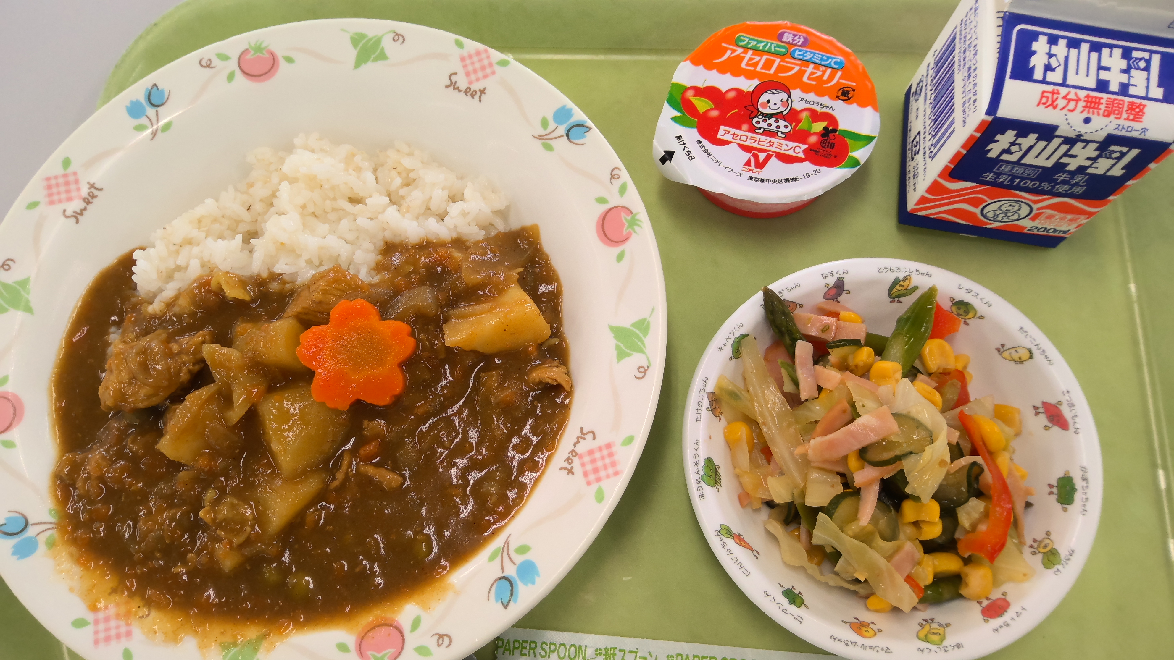 献立名:お祝いカレーライス、牛乳、春野菜サラダ、アセロラゼリー