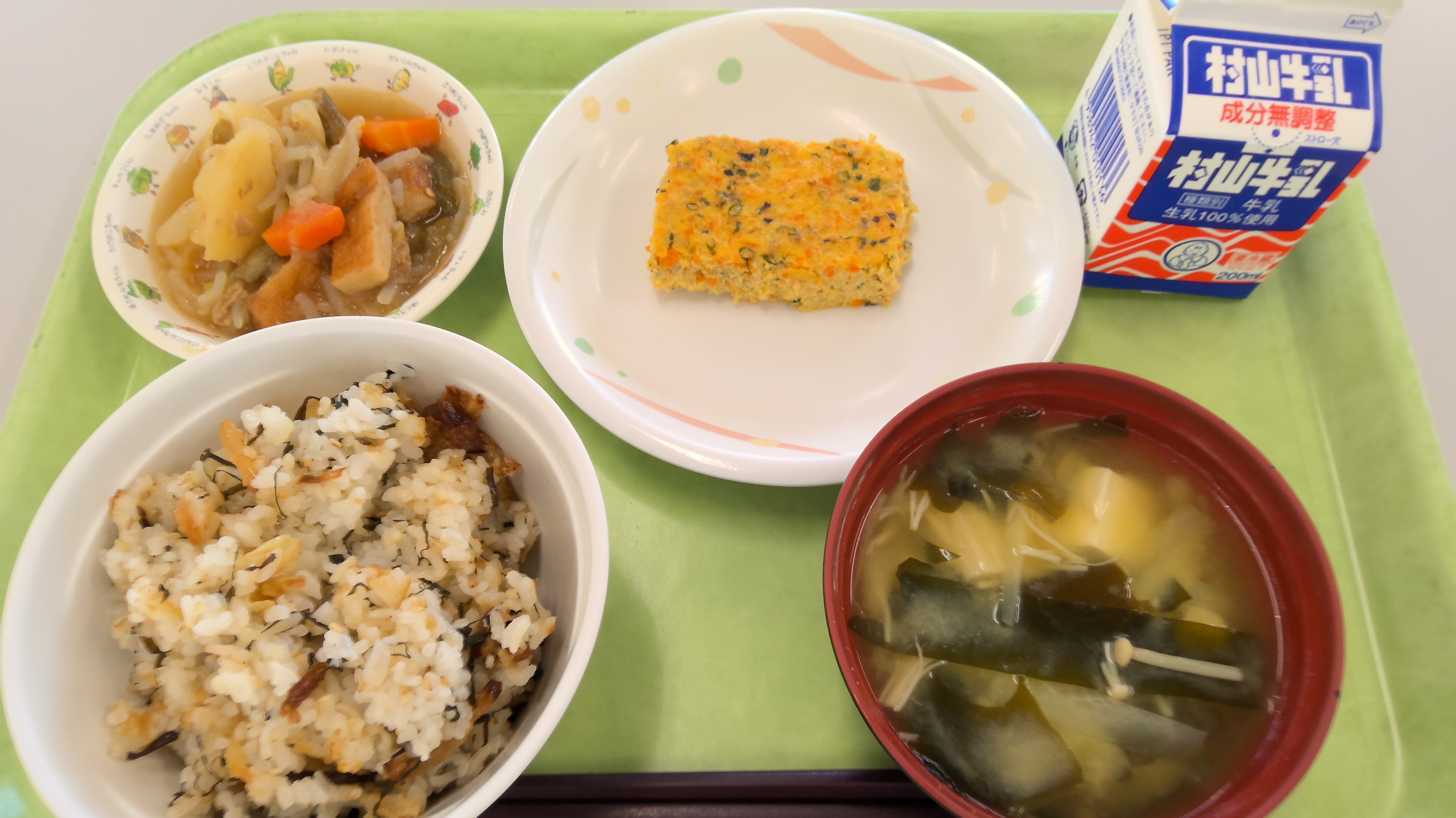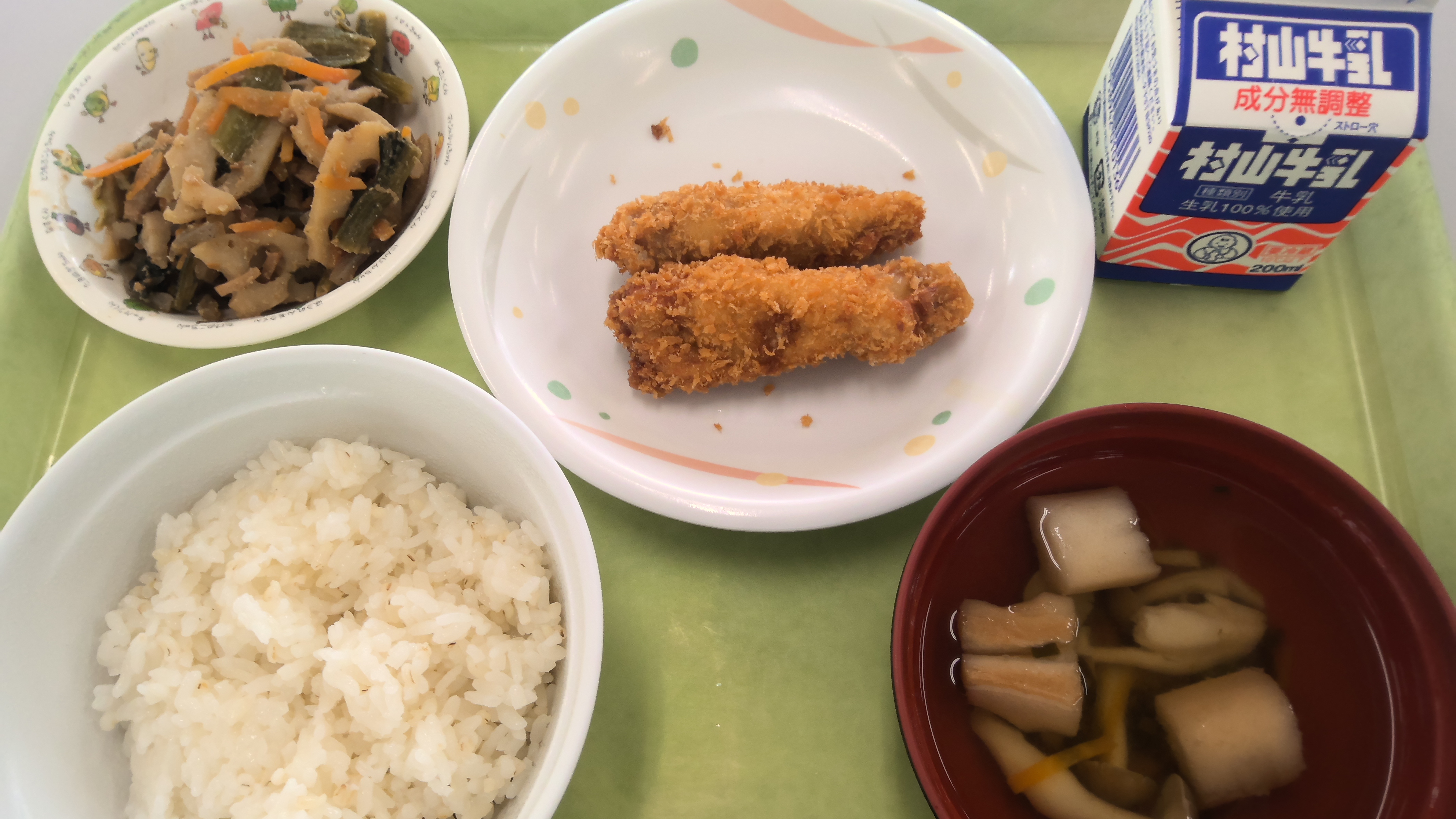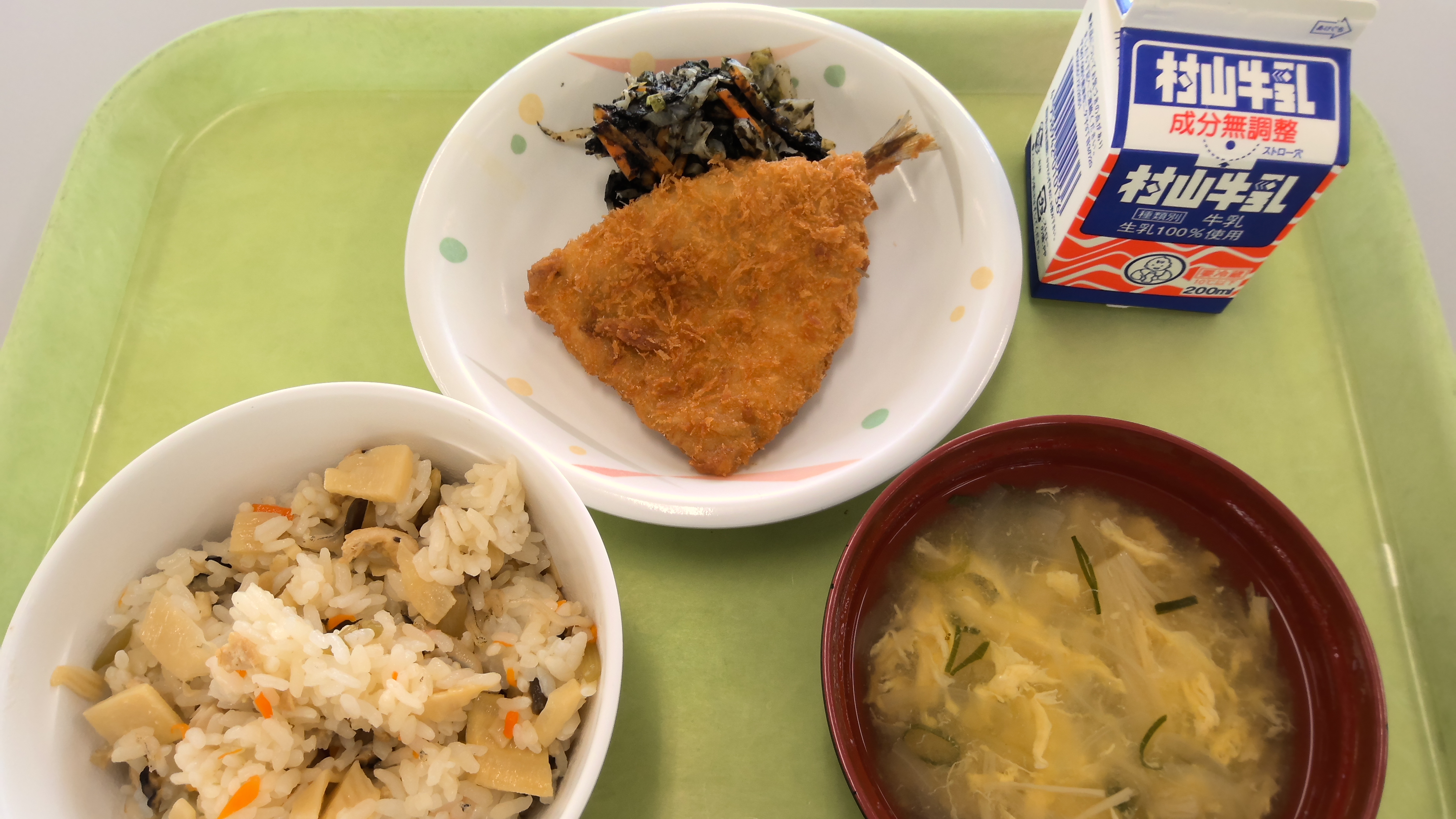 献立名:たけのことふきの混ぜごはん、牛乳、あじフライ、磯香あえ、かきたま汁
