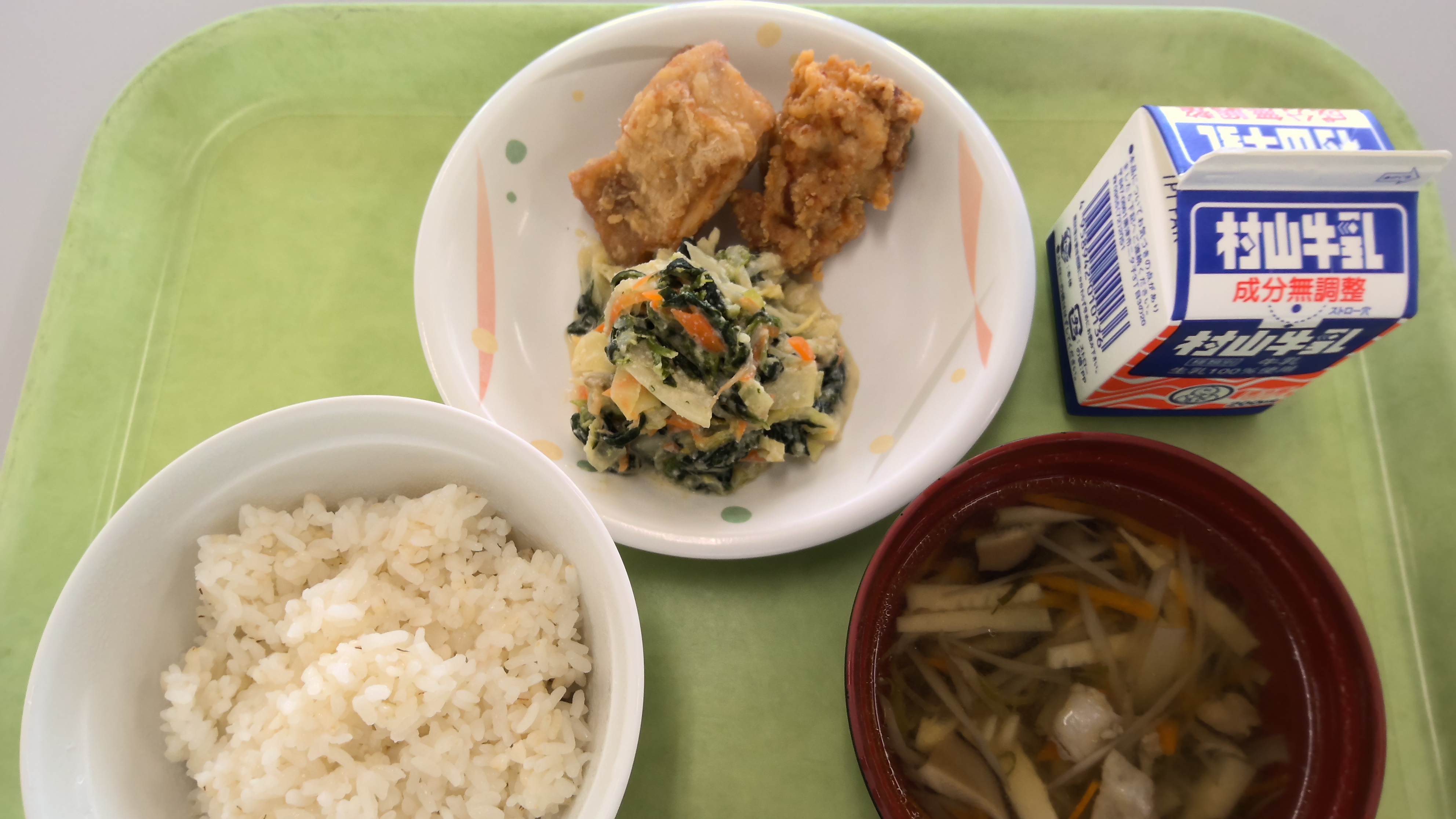 献立名:麦ごはん、牛乳、鶏肉のから揚げ、アーモンドあえ、沢煮椀