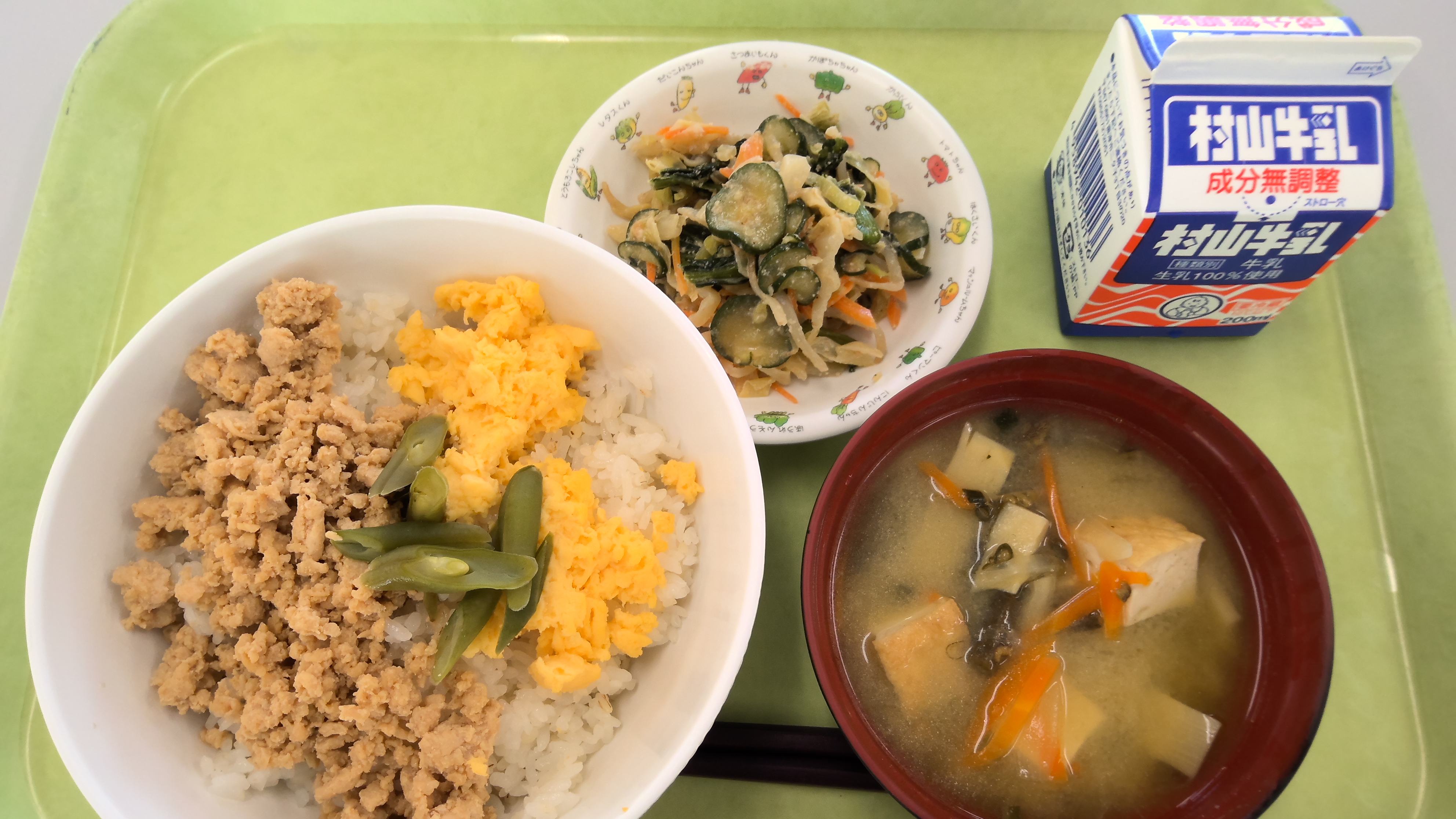 献立名:そぼろ丼、牛乳、ごまあえ、わらびとたけのこのみそ汁