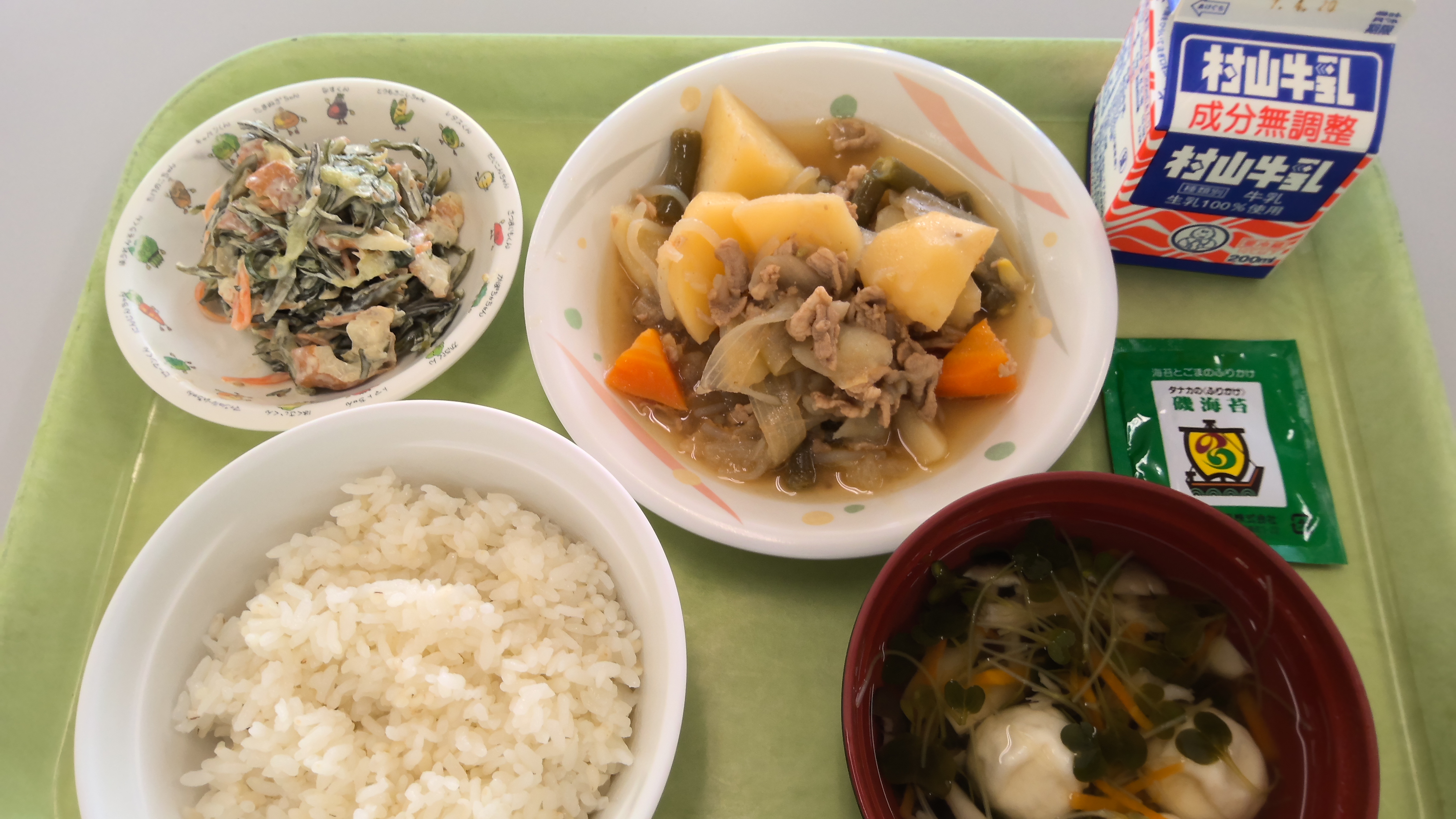 献立名:麦ごはん(ふりかけ)、牛乳、肉じゃが、茎わかめのサラダ、はんぺん汁