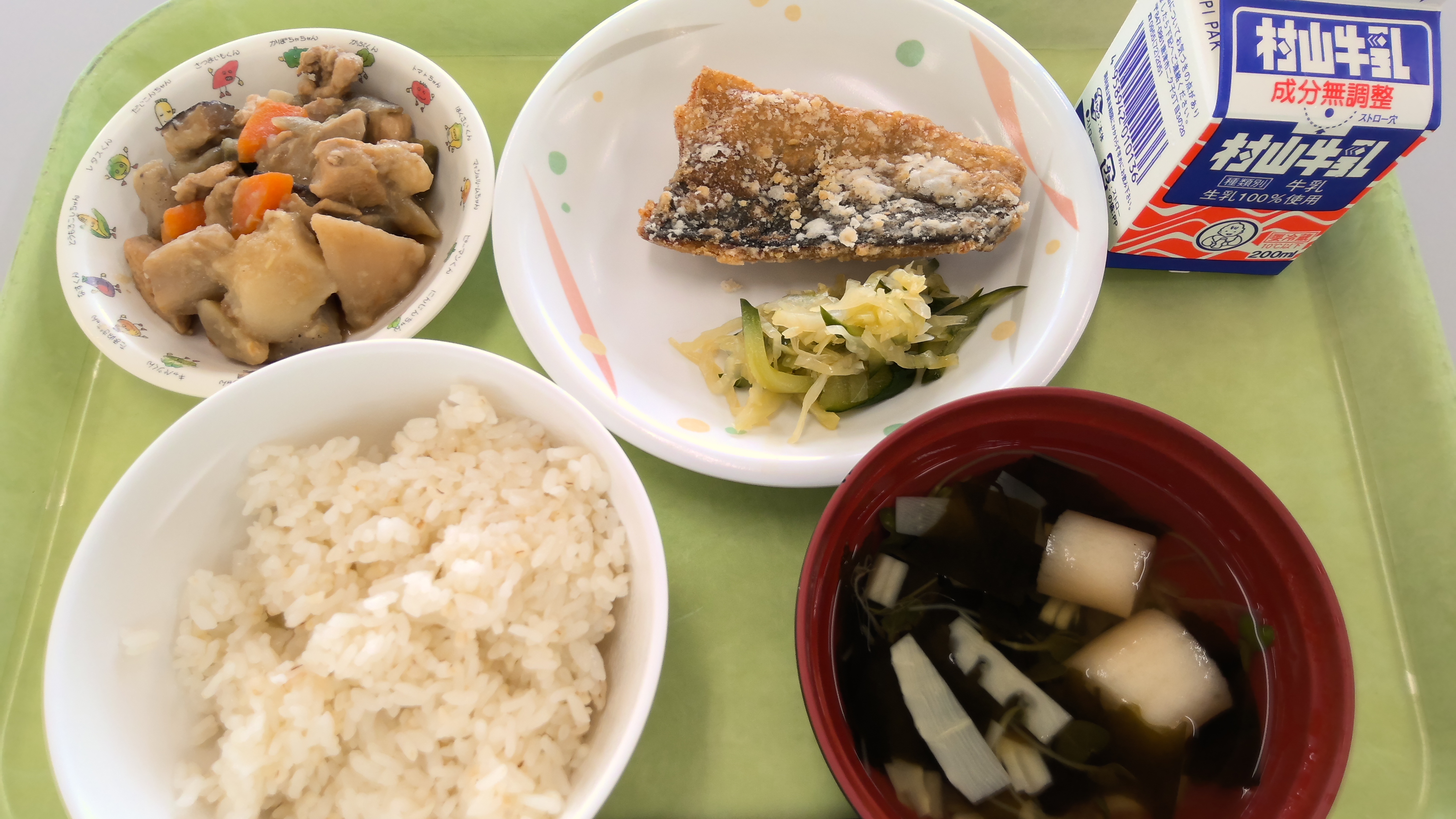献立名:麦ごはん、牛乳、さばの竜田揚げ・ゆで野菜、筑前煮、若竹汁