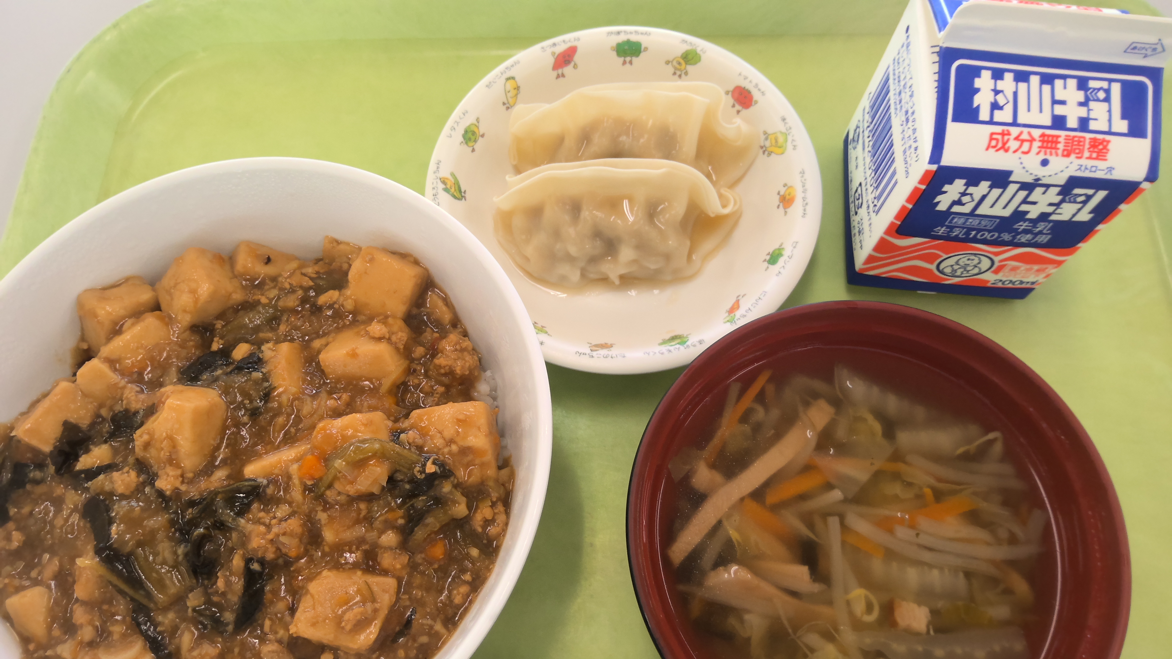 献立名:麻婆丼(伊万里産もち麦入りごはん)、牛乳、ぎょうざ、中華スープ