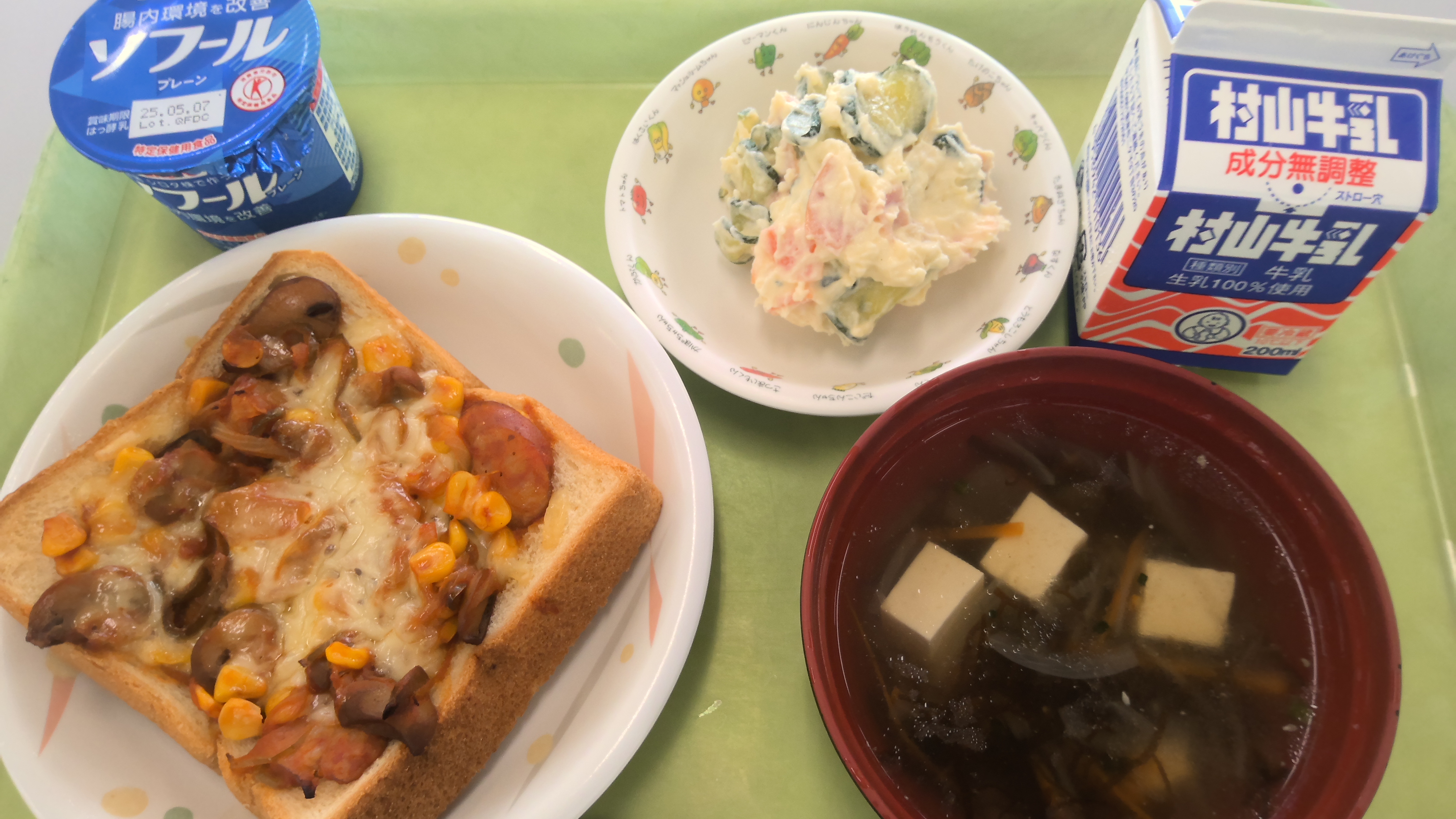 献立名:ピザトースト、牛乳、ポテトサラダ、もずくとごまのスープ、ヨーグルト