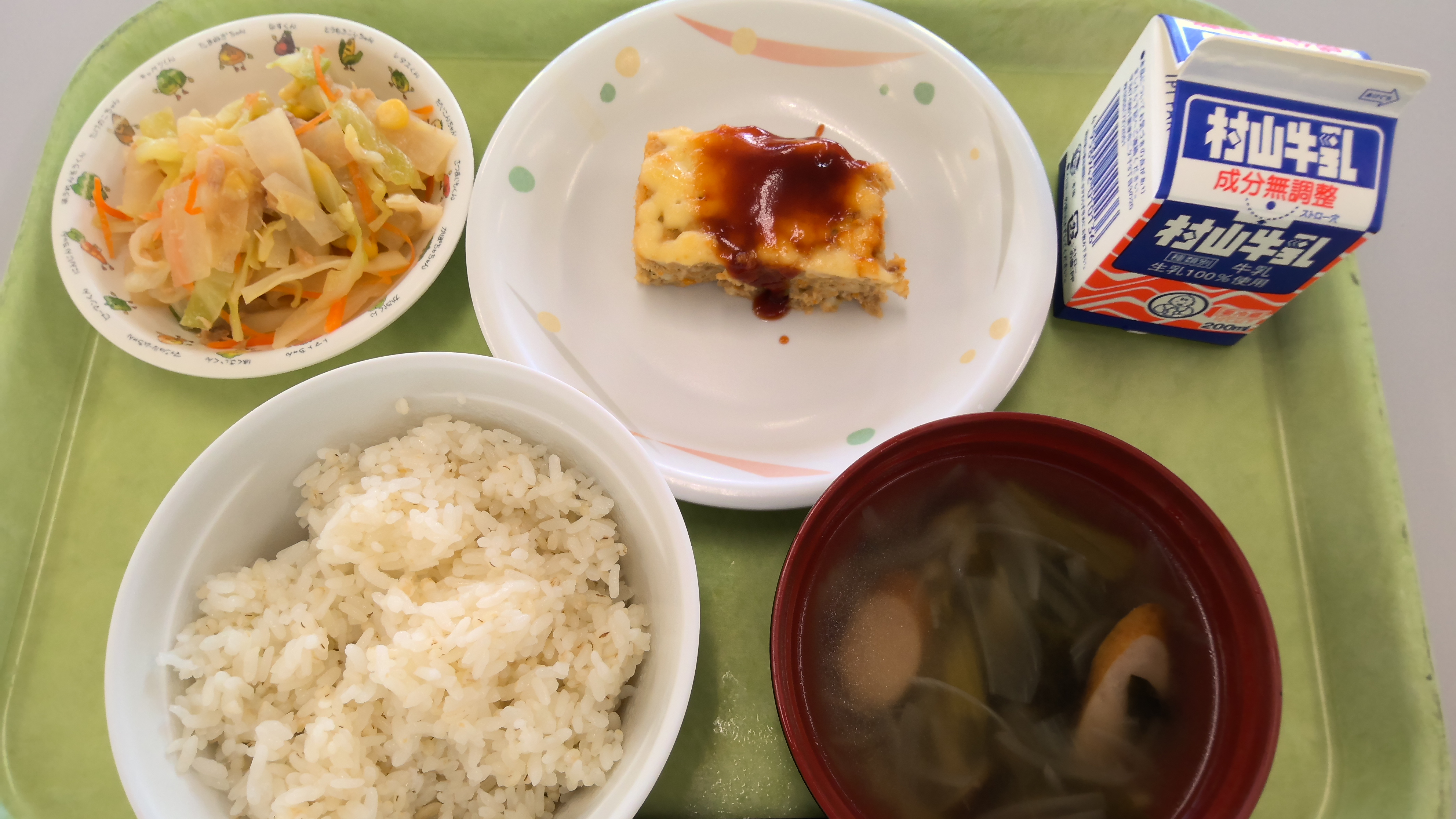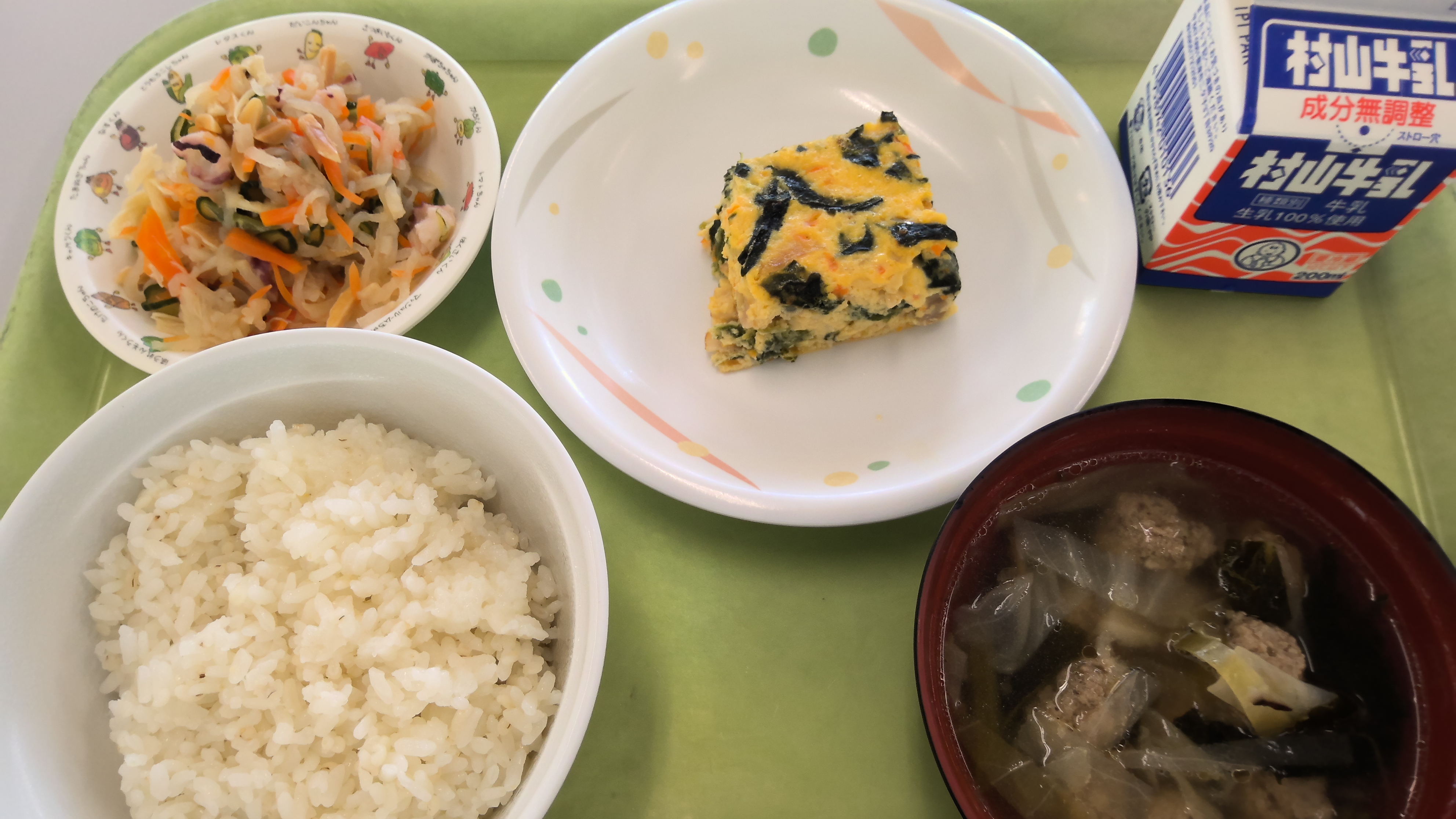 献立名:麦ごはん、牛乳、キッシュ風たまごのオーブン焼き、かみかみサラダ、ミートボールスープ