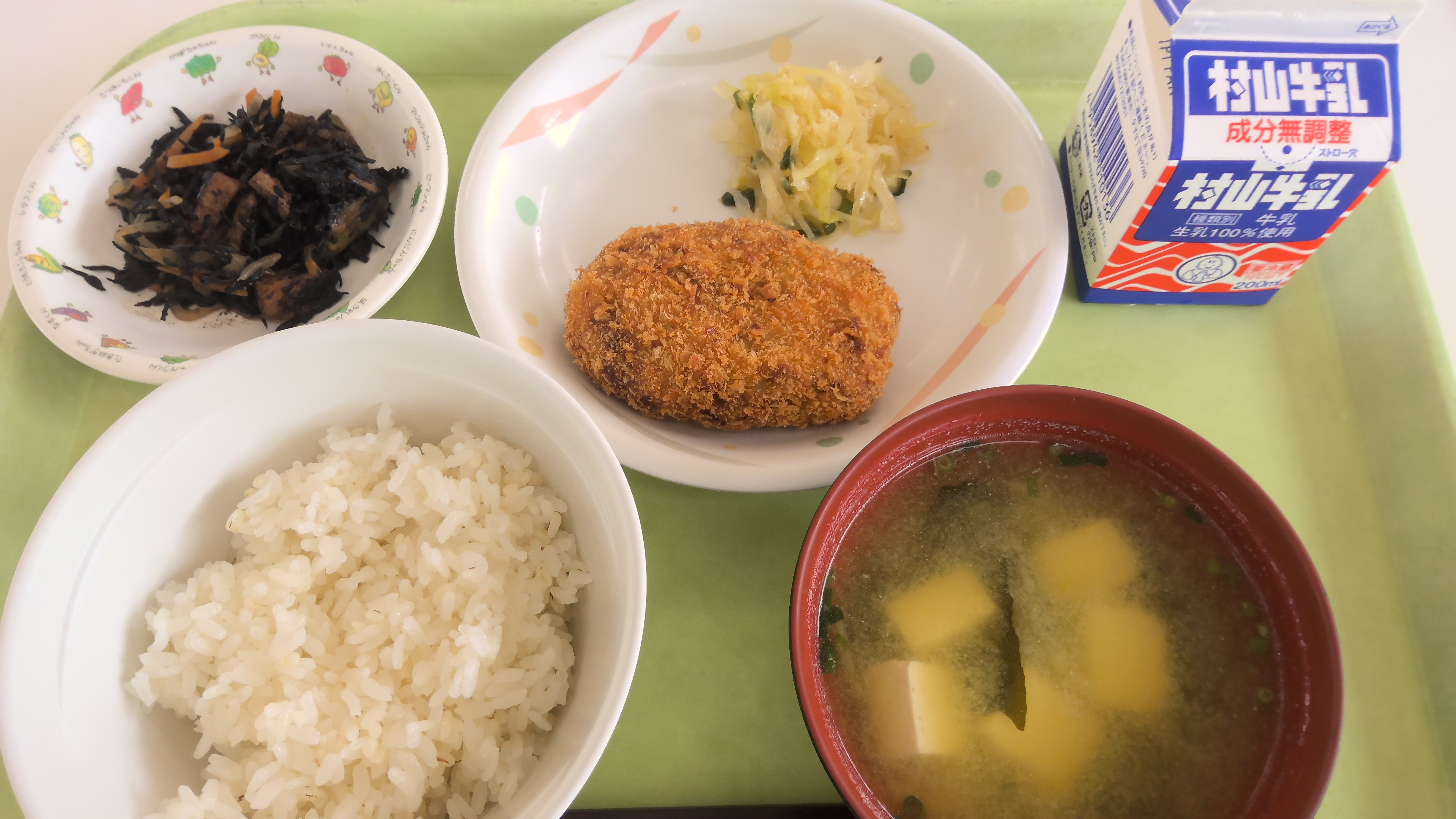 献立名:麦ごはん、牛乳、コロッケ・ゆで野菜、ひじき煮、みそ汁