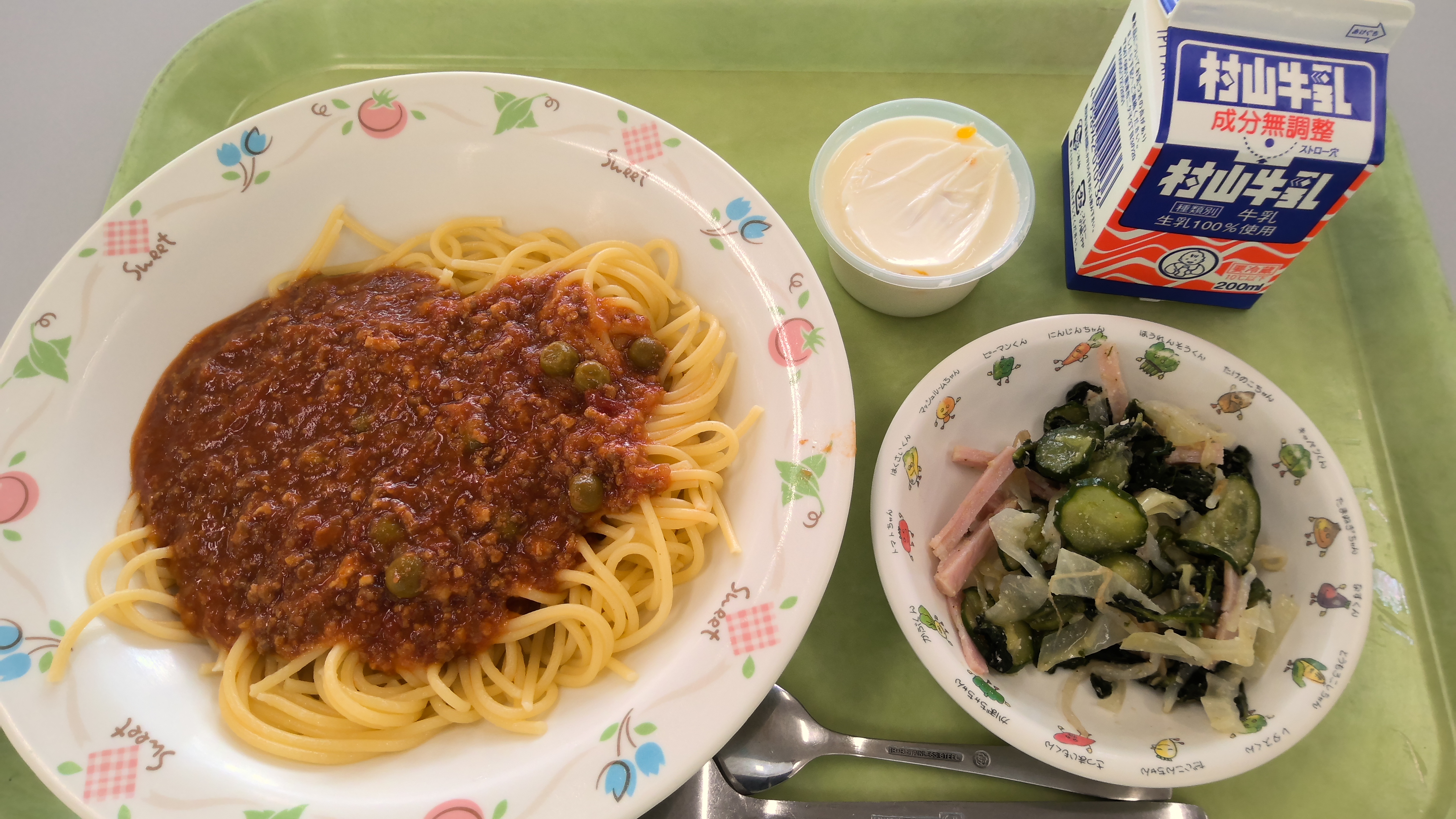 献立名:スパゲッティミートソース、牛乳、ほうれんそうのごまドレッシングサラダ、さがみかん入りミルクゼリー