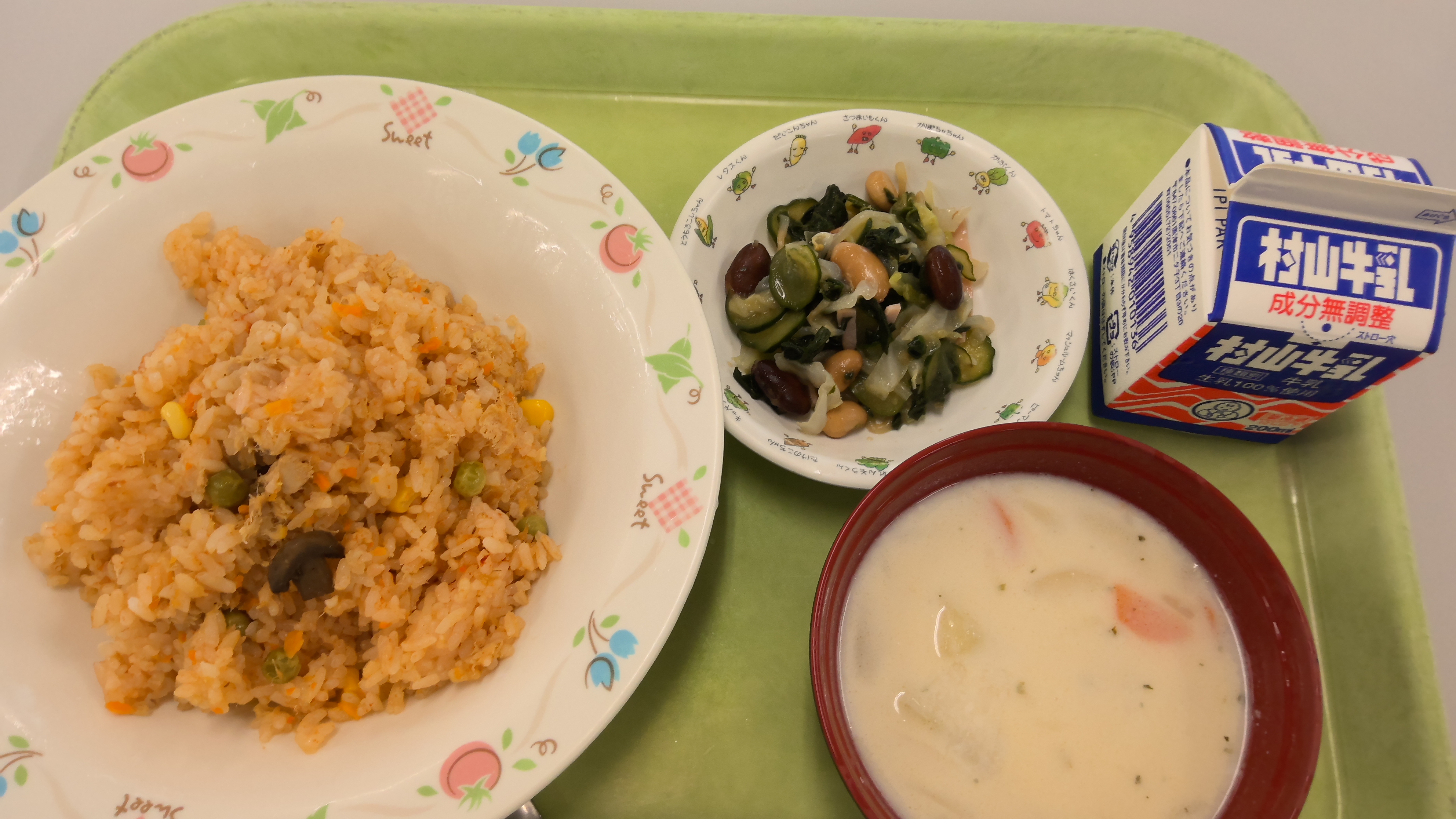 献立名:ツナピラフ、牛乳、まめまめサラダ、クラムチャウダー