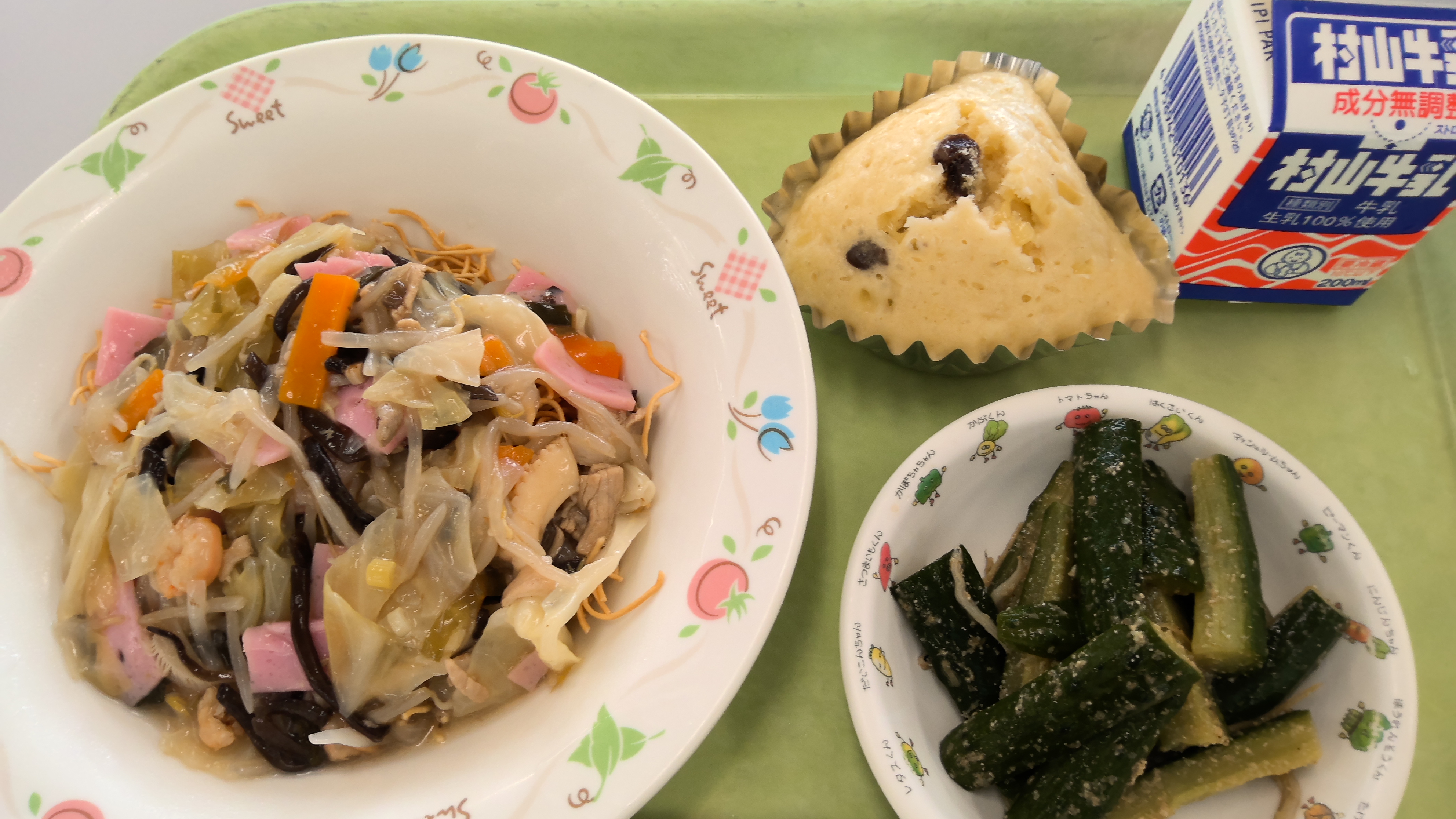 献立名:皿うどん、牛乳、たたききゅうり、蒸しパン