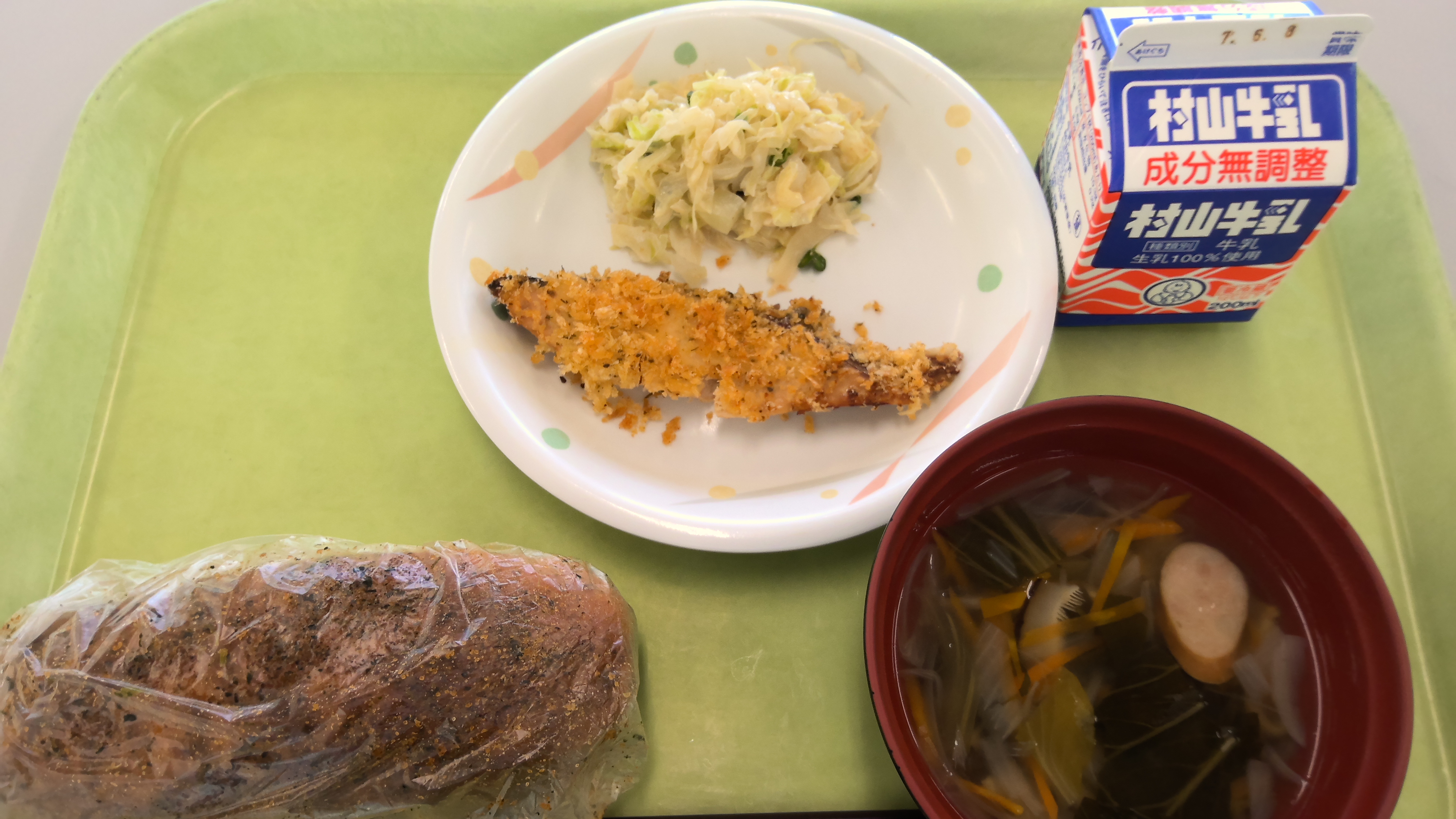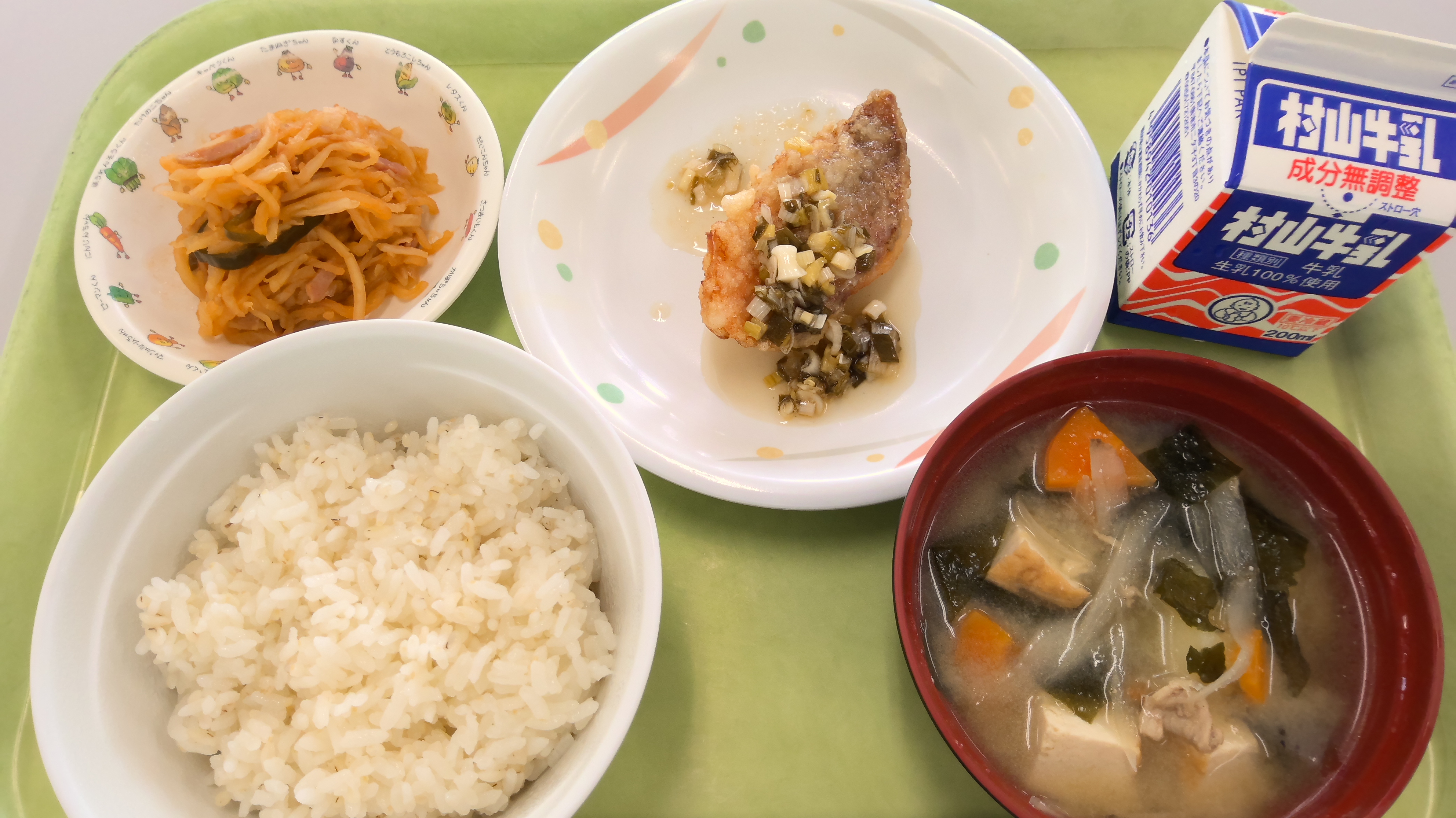 献立名:麦ごはん、牛乳、揚げ魚の塩だれかけ、切り干し大根のケチャップ炒め、豚汁