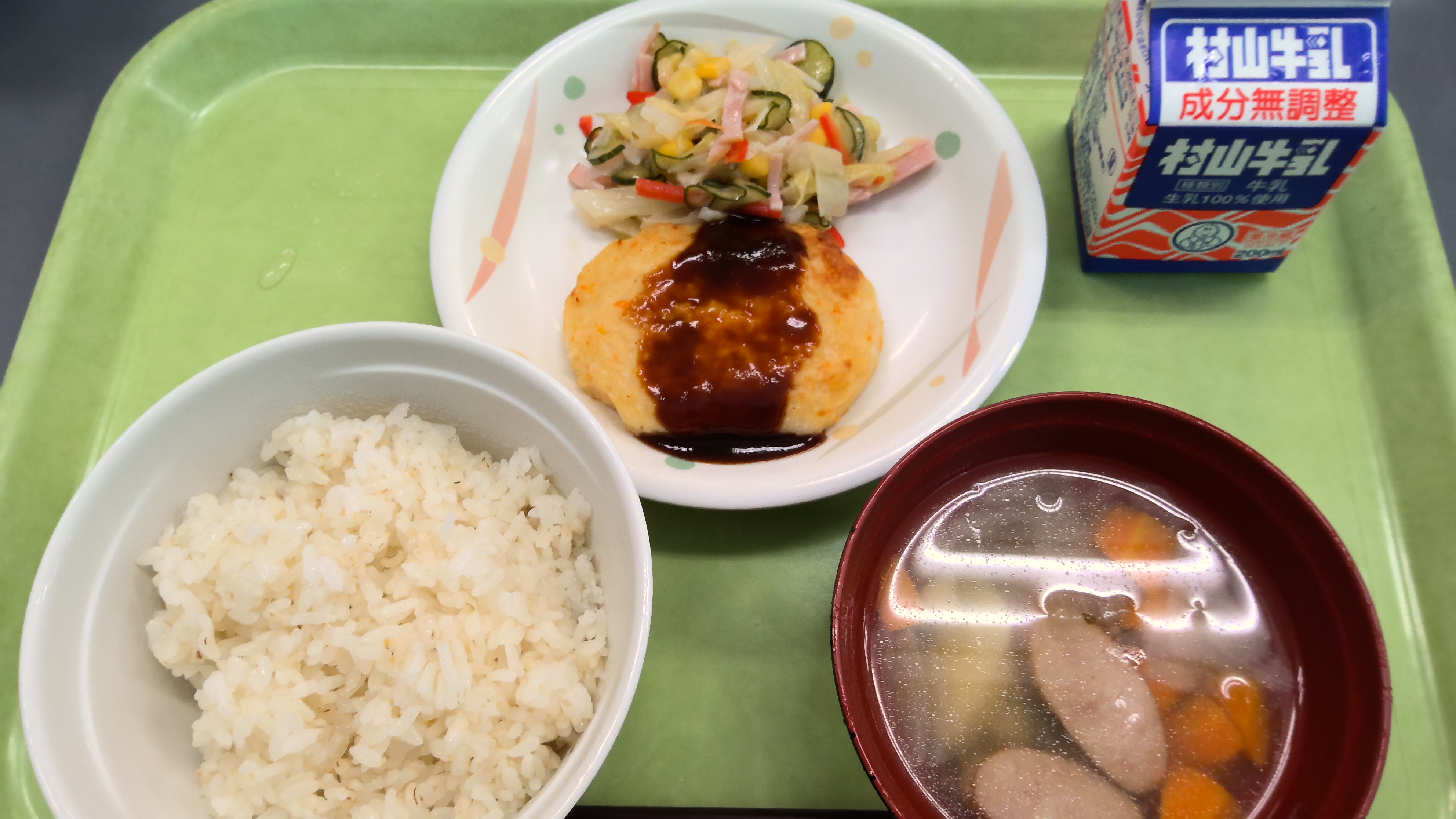 献立名:麦ごはん、牛乳、おさかなハンバーグ、フレンチサラダ、ポトフ