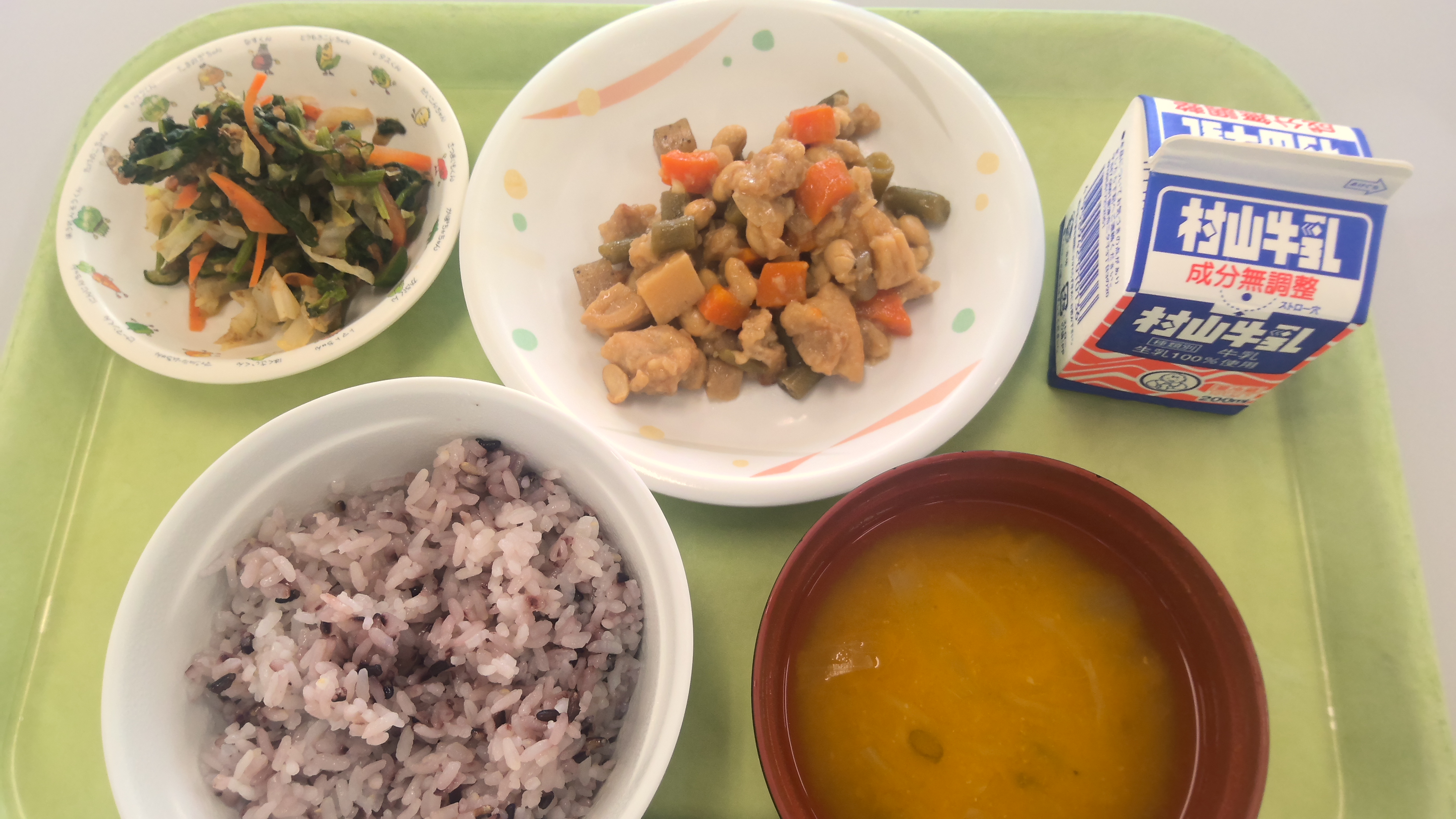 献立名:伊万里産黒米ごはん、牛乳、鶏肉と大豆の煮物、おかかあえ、みそ汁