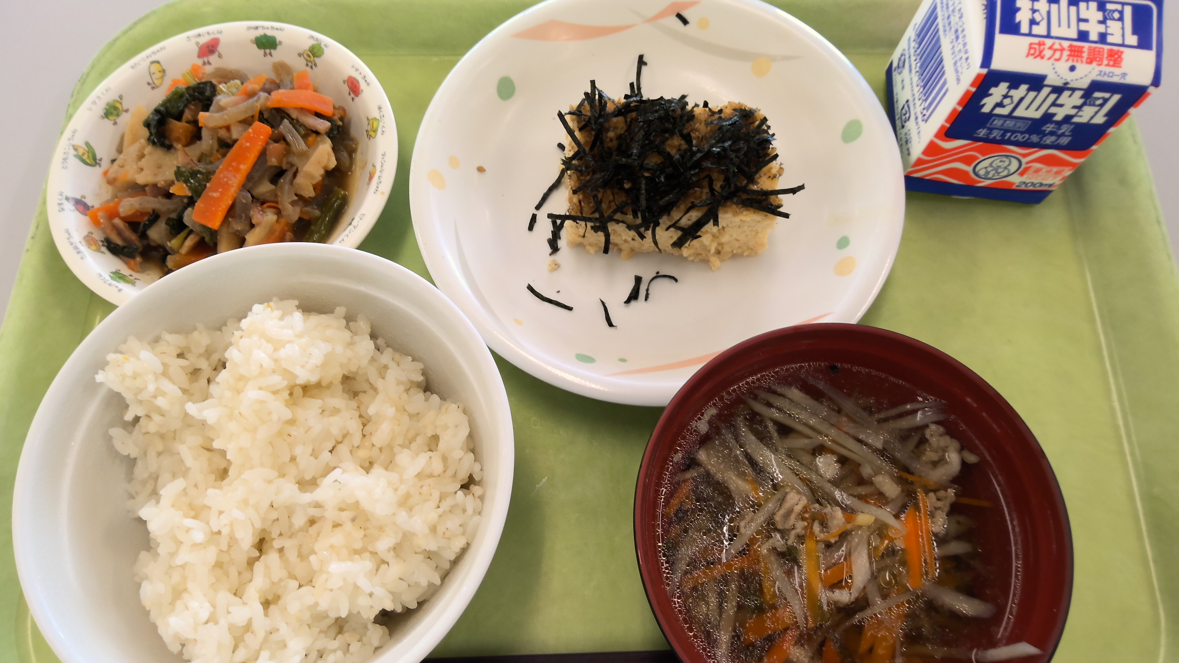 献立名:麦ごはん、牛乳、松風焼き(佐賀海苔風味)、こんにゃくと野菜の炒め物、沢煮椀