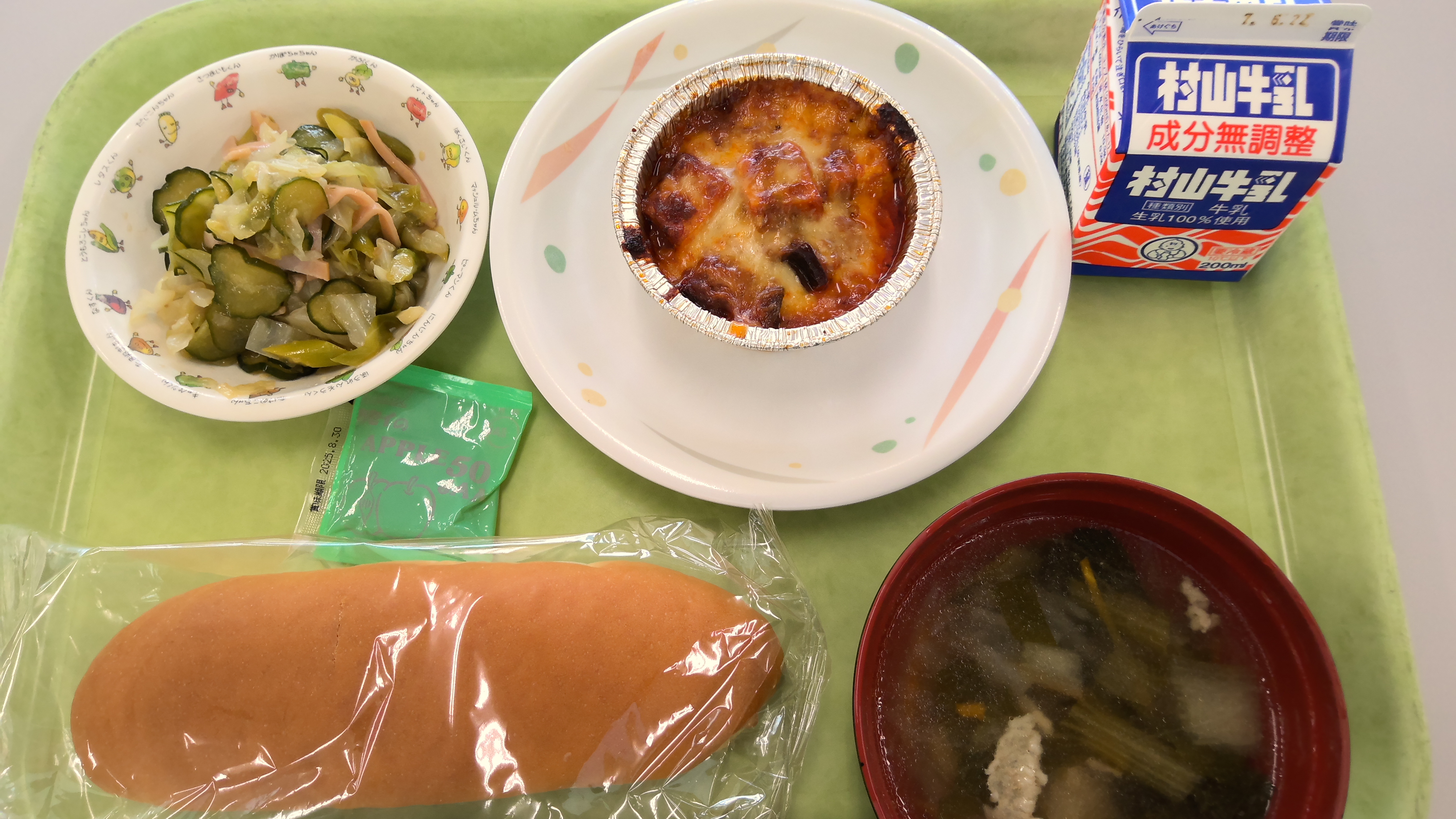 献立名:ミルクパン(りんごジャム)、牛乳、なすと豆腐のミートソース焼き、アスパラガスのサラダ、コンソメスープ
