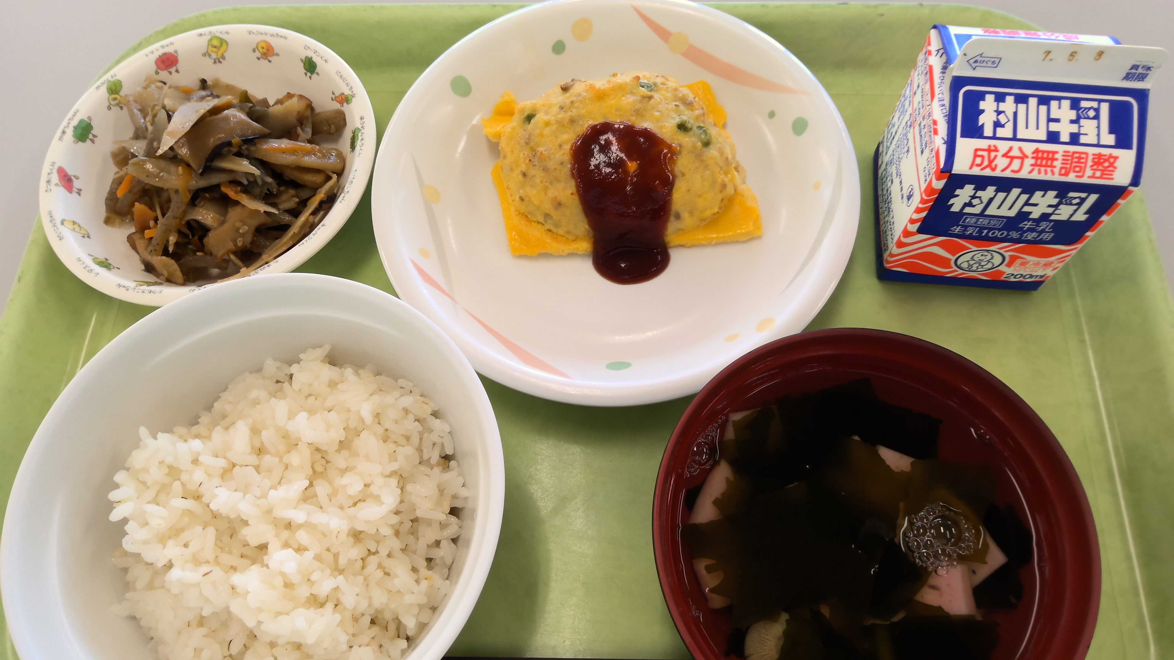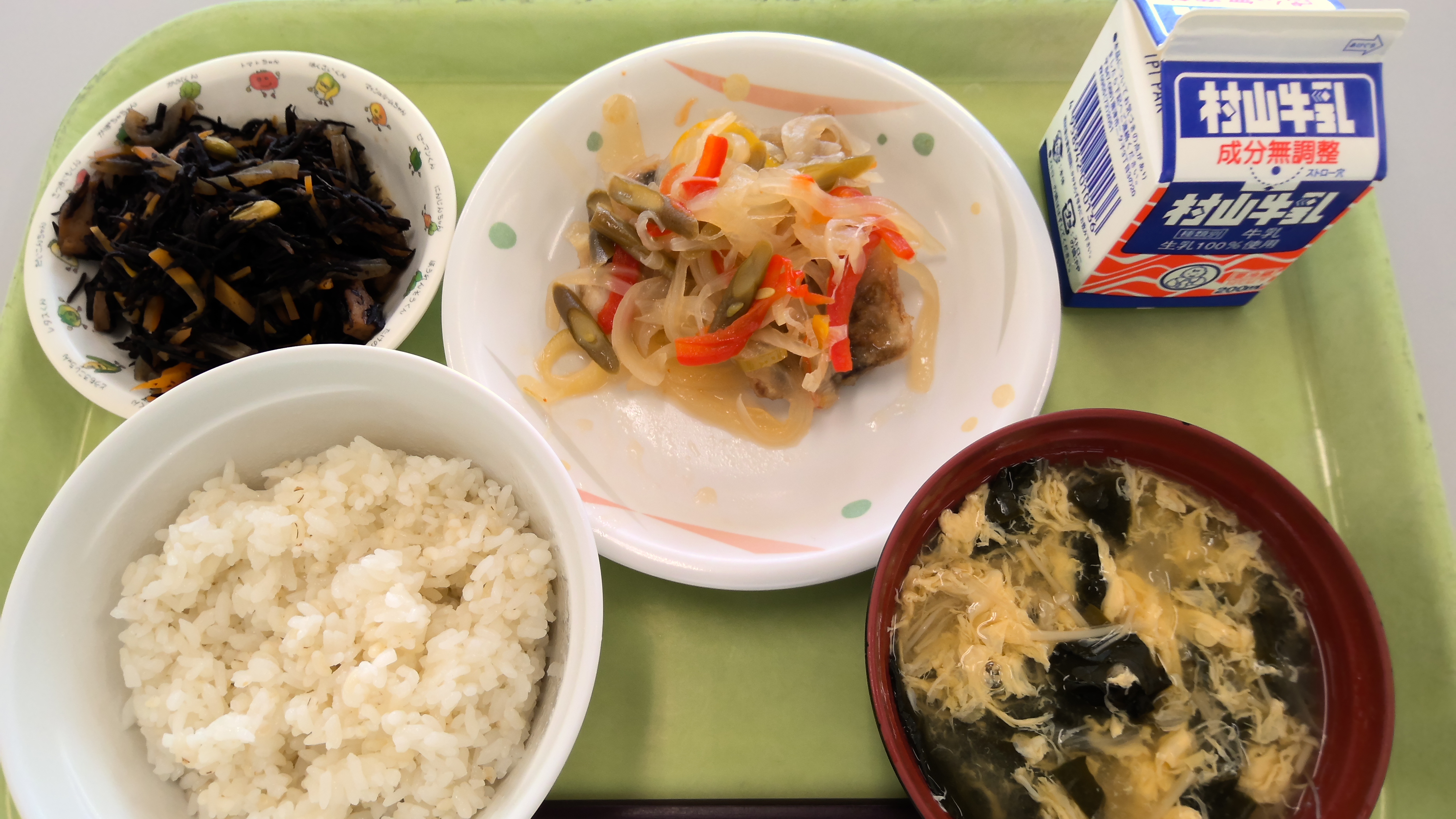 献立名:麦ごはん、牛乳、あじの南蛮漬け、ひじき煮、かきたま汁