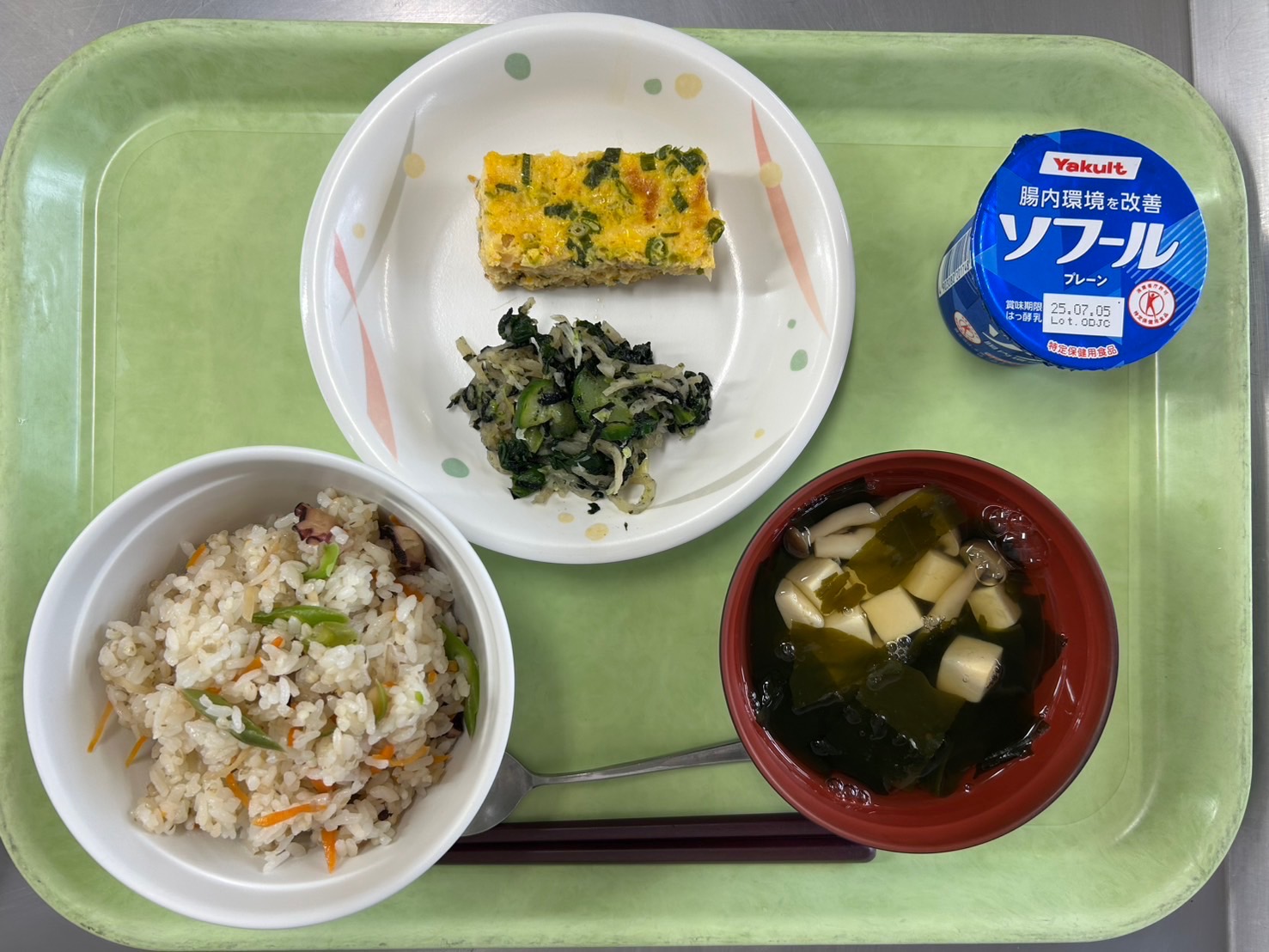献立名:たこ飯、牛乳、千草焼き、磯香あえ、すまし汁、ヨーグルト