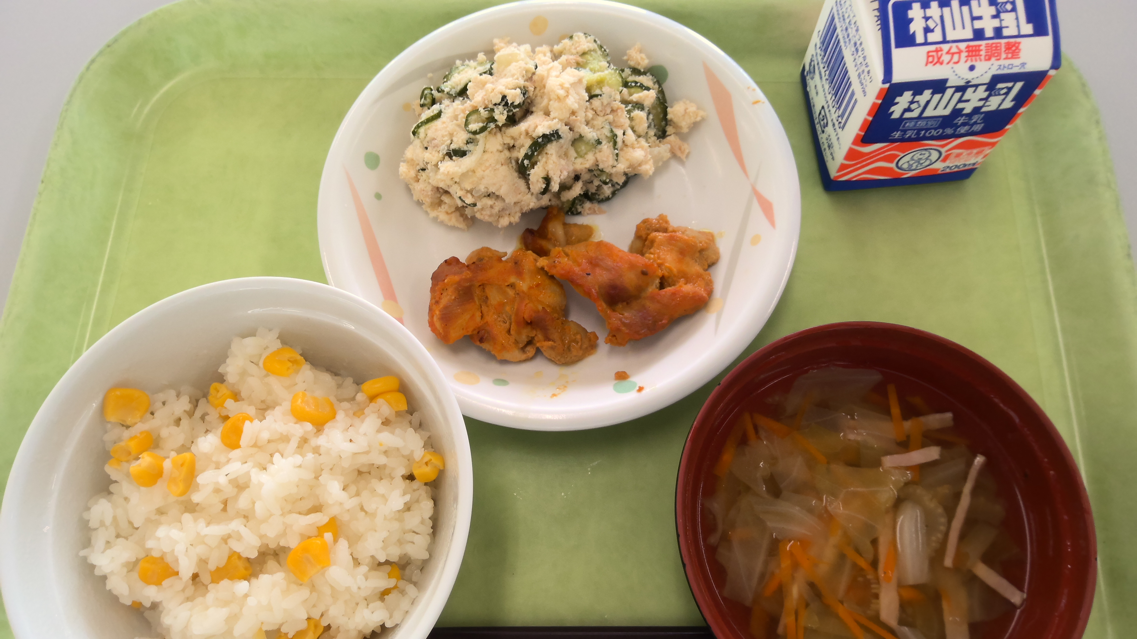 献立名:とうもろこしごはん、牛乳、タンドリーチキン、おからサラダ、キャベツのスープ