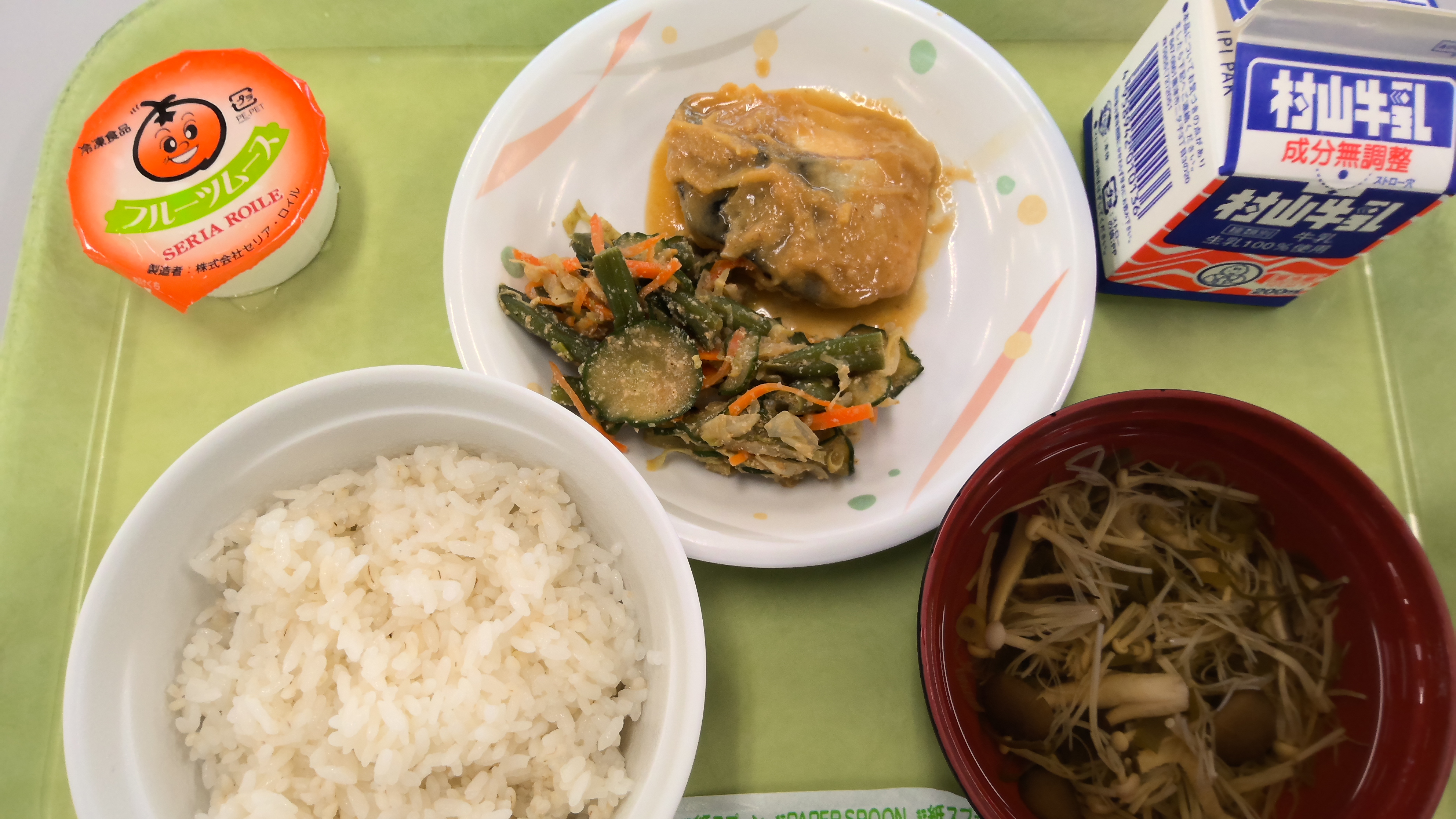 献立名:麦ごはん、牛乳、さばのみそ煮・野菜の甘煮、ごま酢あえ、きのこ汁、フルーツムース