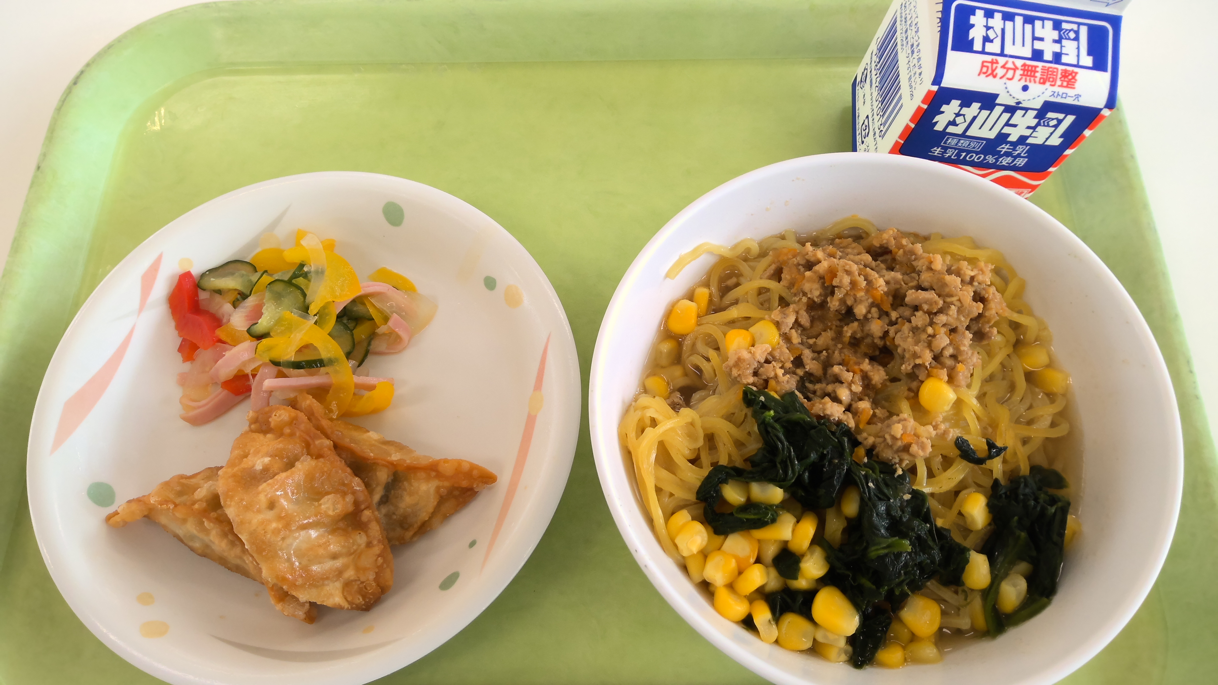 献立名:肉みそラーメン、牛乳、揚げ野菜ぎょうざ、カラフルマリネ