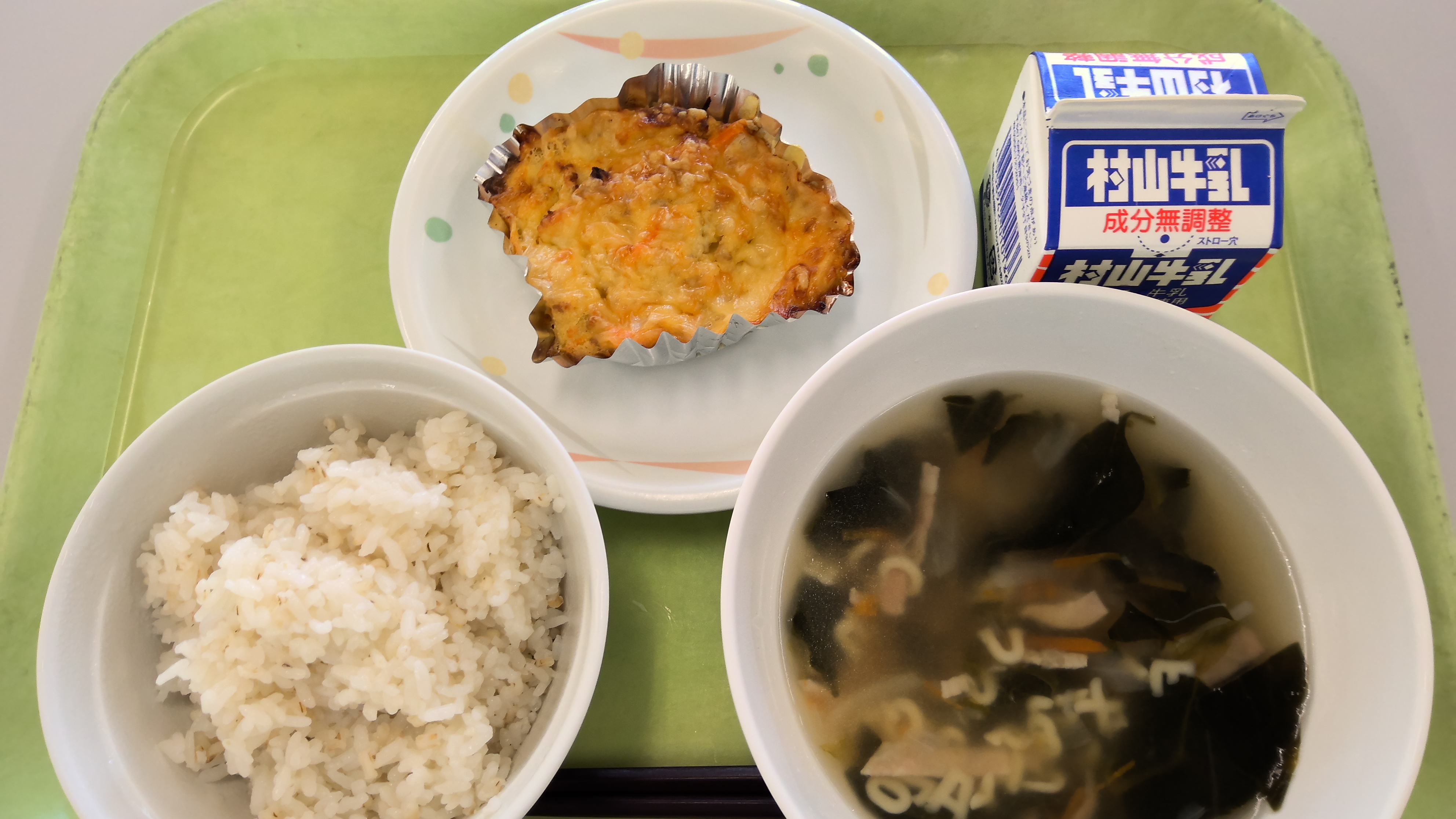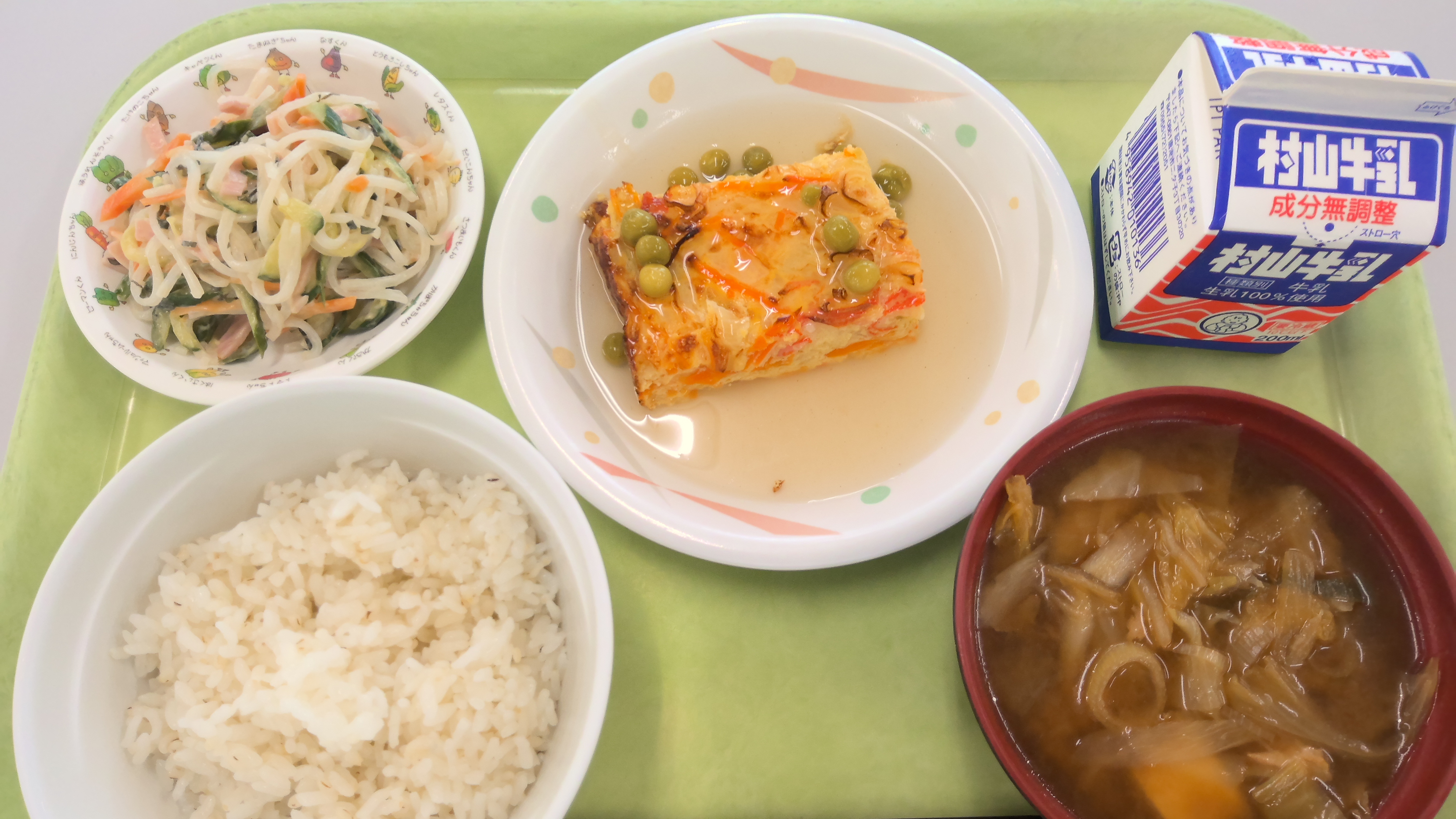 献立名:麦ごはん、牛乳、おからとキャベツのキッシュ、ABCマカロニスープ ※諸事情により、献立変更しています💦