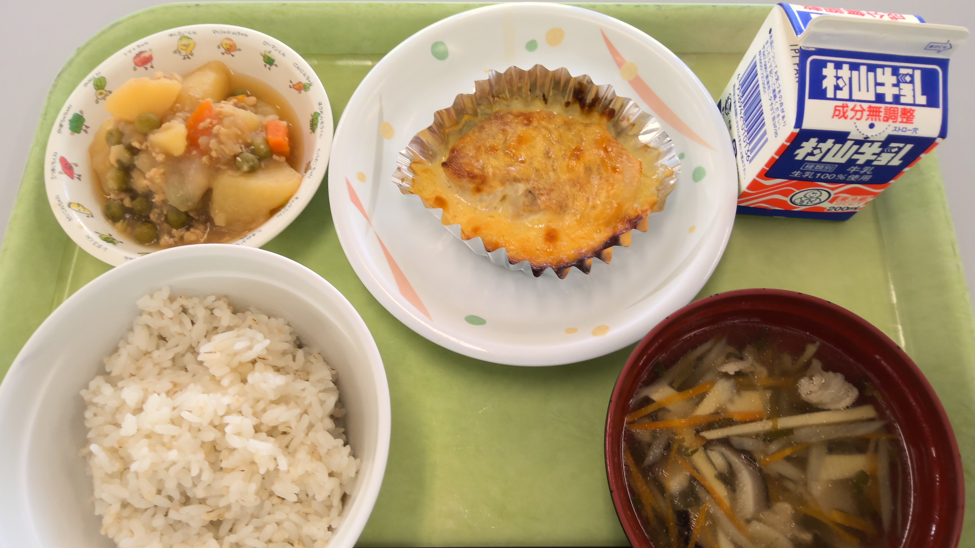 献立名:麦ごはん、牛乳、白身魚のみそマヨチーズ焼き、じゃがいものそぼろ煮、沢煮椀