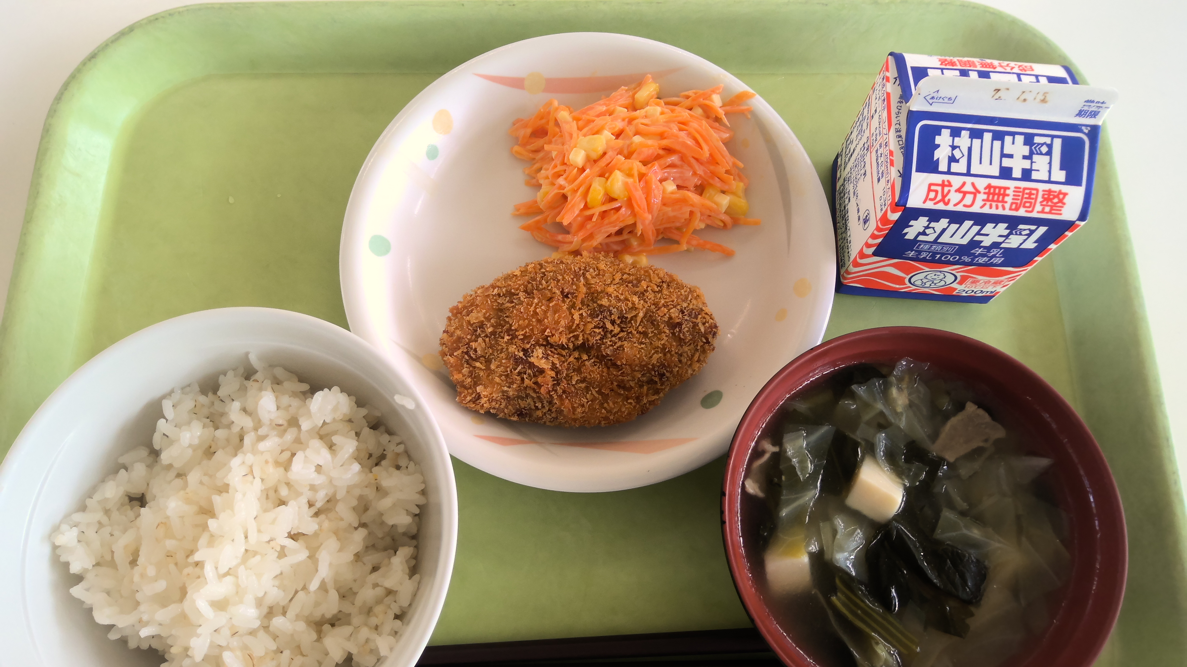 献立名:麦ごはん、牛乳、かぼちゃコロッケ、にんじんサラダ、豆腐とほうれんそうのスープ