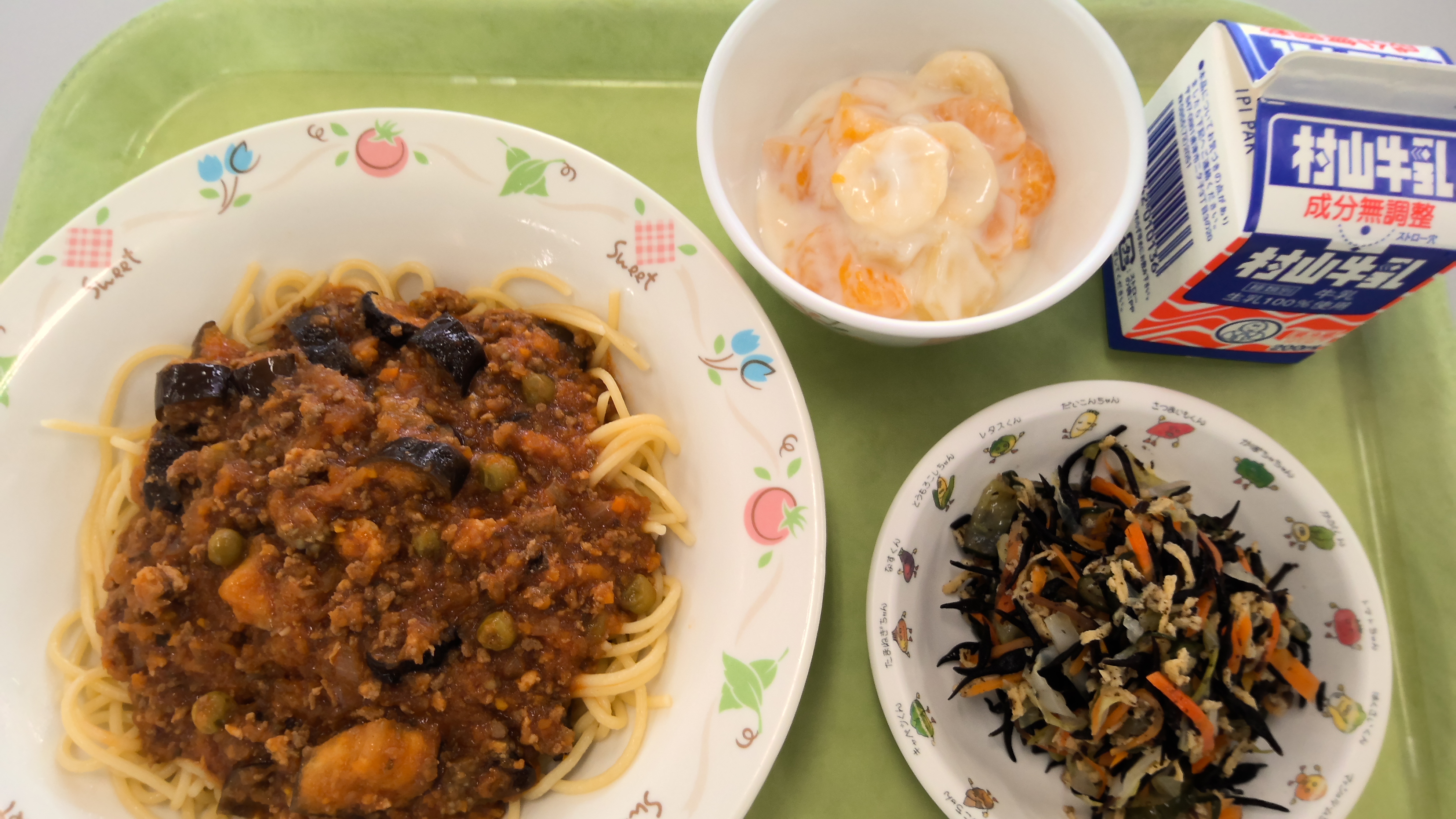 献立名:なすとひき肉のスパゲッティ、牛乳、ひじきの甘酢あえ、フルーツヨーグルト