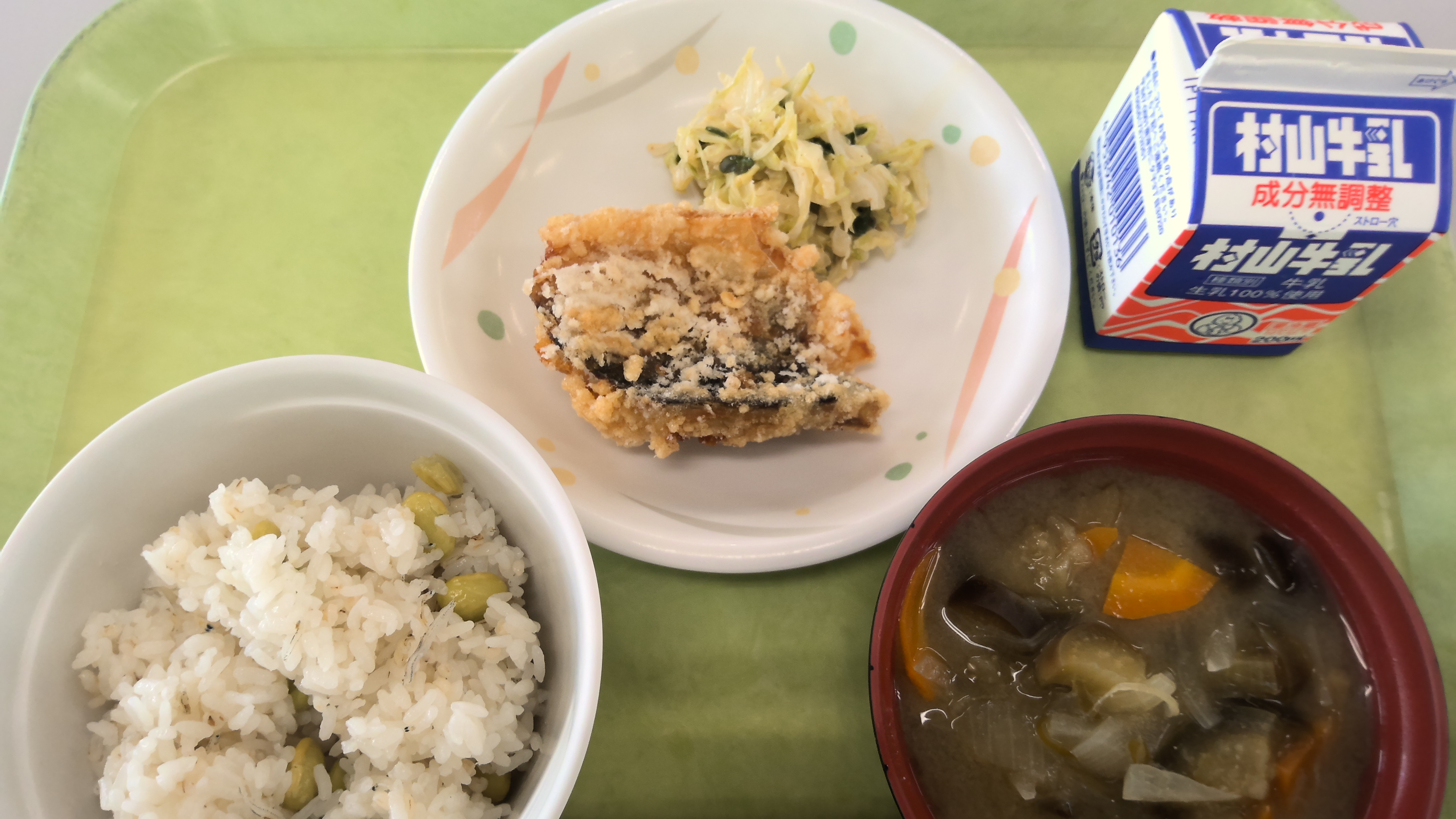 献立名:翡翠飯(枝豆ごはん)、牛乳、さばの竜田揚げ・添え野菜、なすのみそ汁