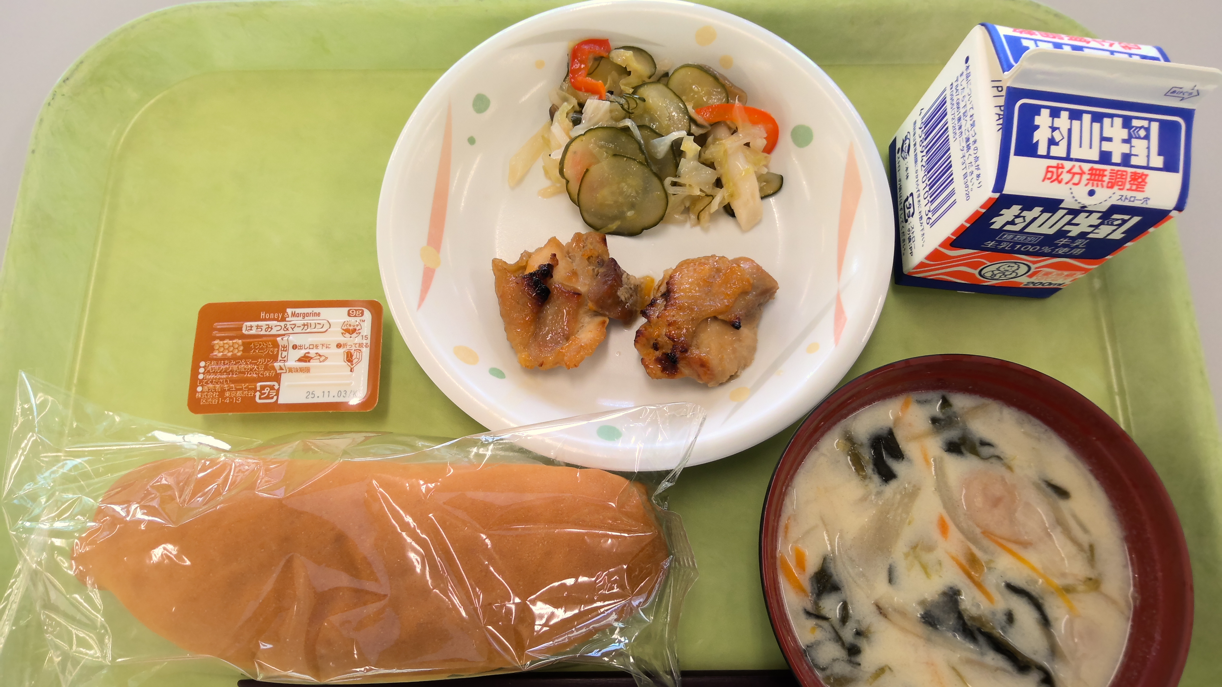 献立名:ミルクパン(はちみつ&マーガリン)、牛乳、鶏肉のマーマレード焼き、きのことキャベツのマリネ、ごぼうのクリームスープ
