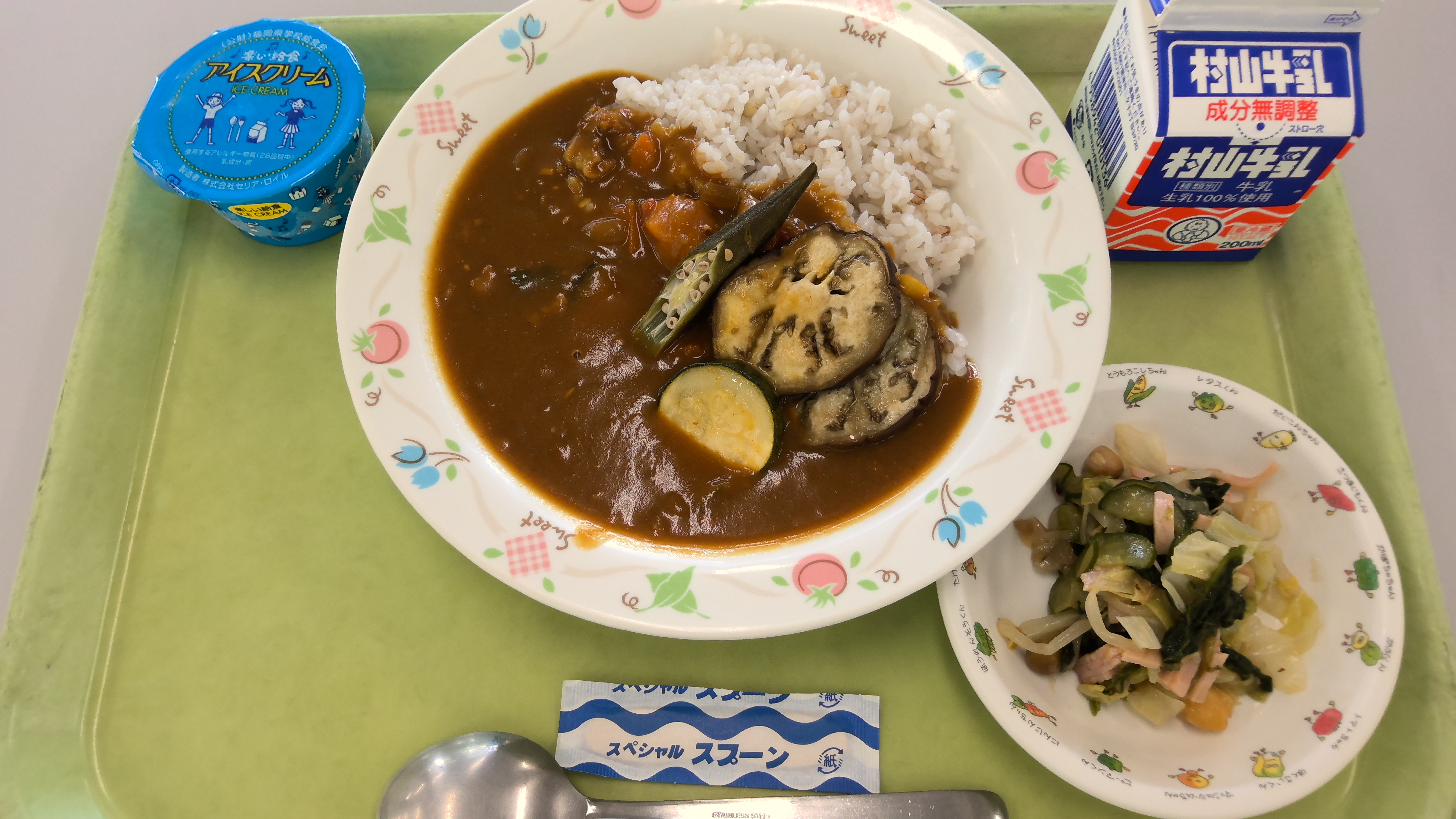 献立名:夏野菜カレー(伊万里産もち麦入りごはん)、牛乳、まめまめサラダ、アイスクリーム
