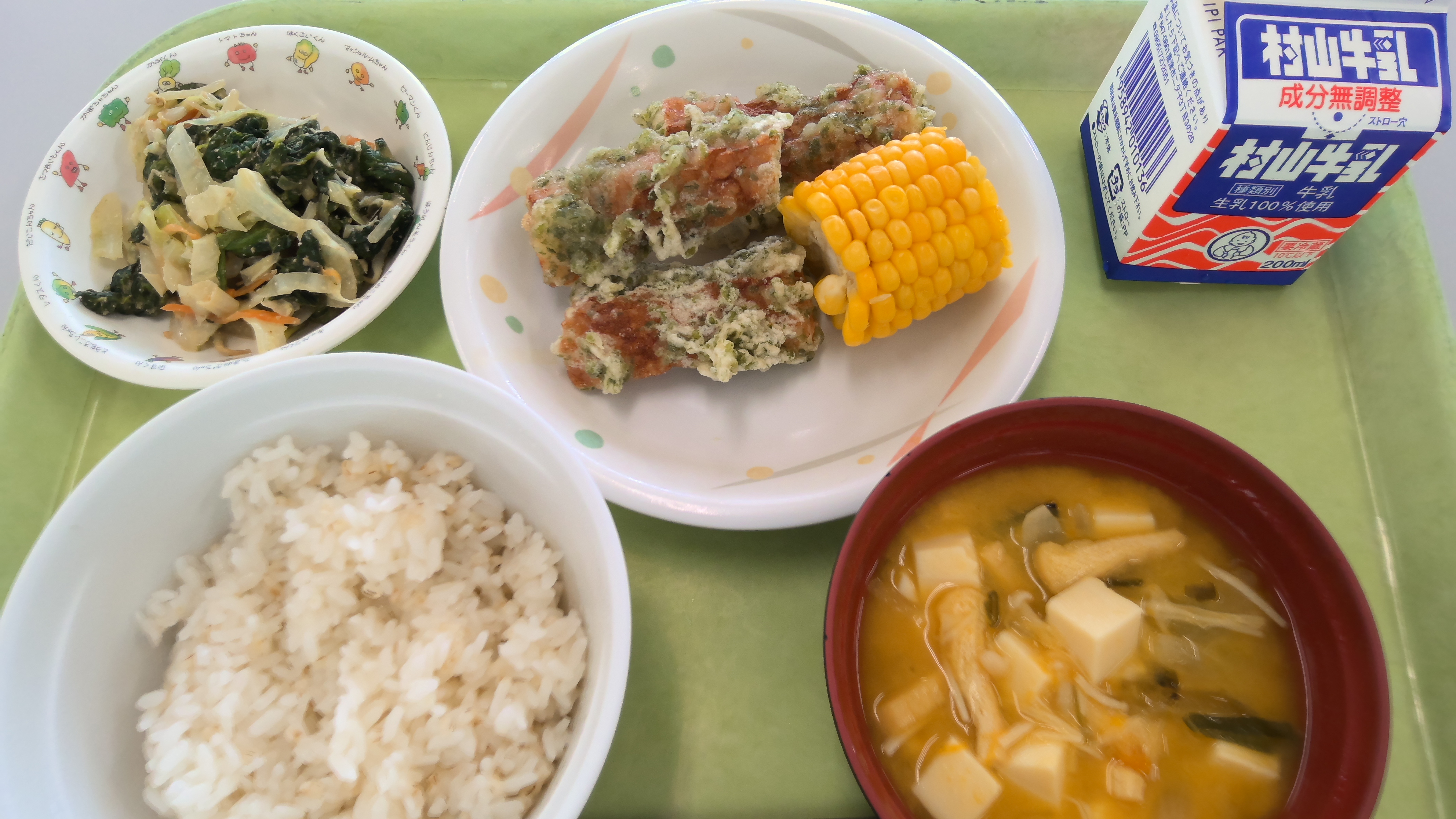 献立名:麦ごはん、牛乳、ちくわの磯辺揚げ、カットコーン、ちくわの磯辺揚げ、みそ汁