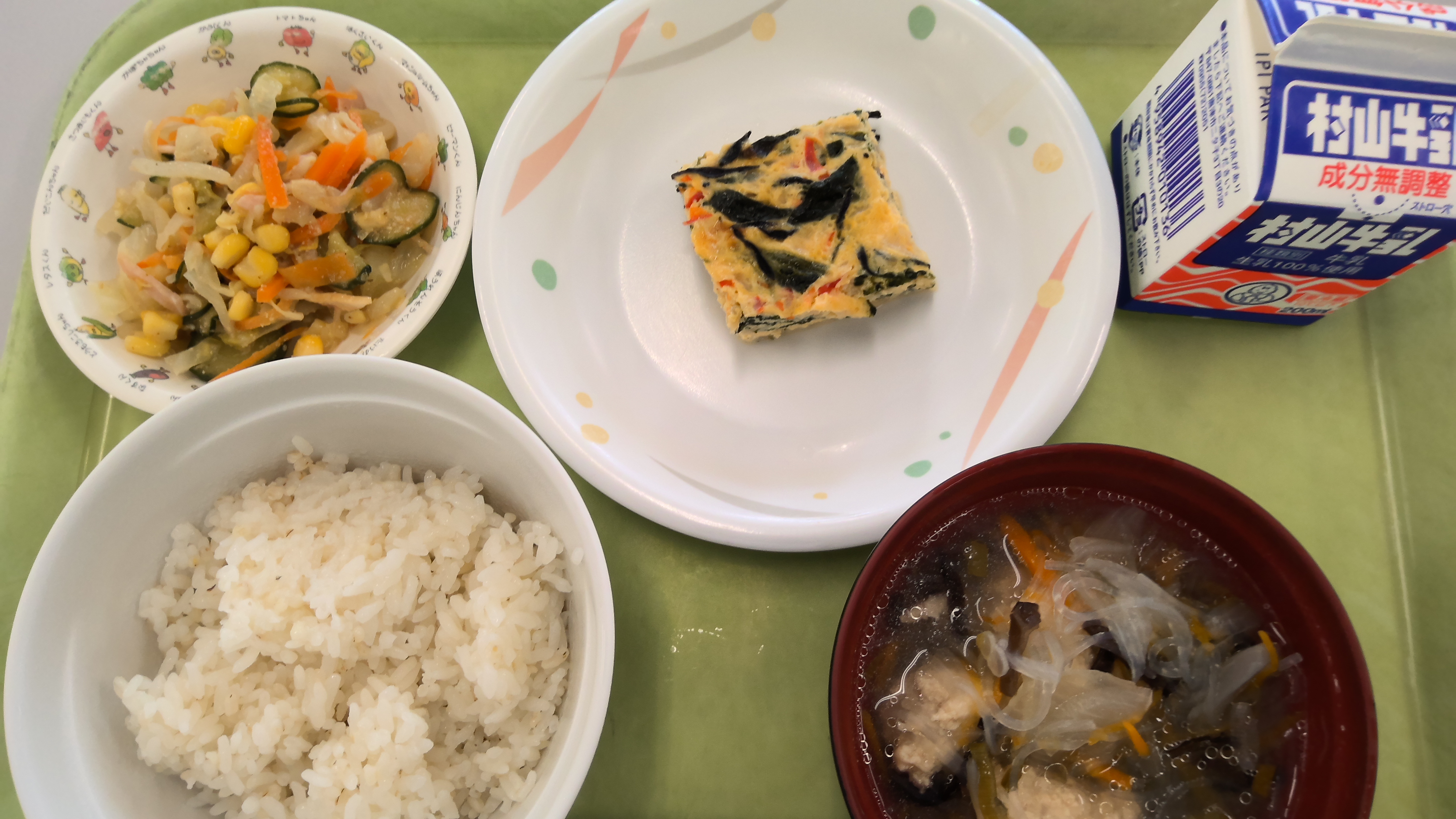 献立名:麦ごはん、牛乳、カラフルたまご焼き、みそドレサラダ、肉団子と春雨のスープ