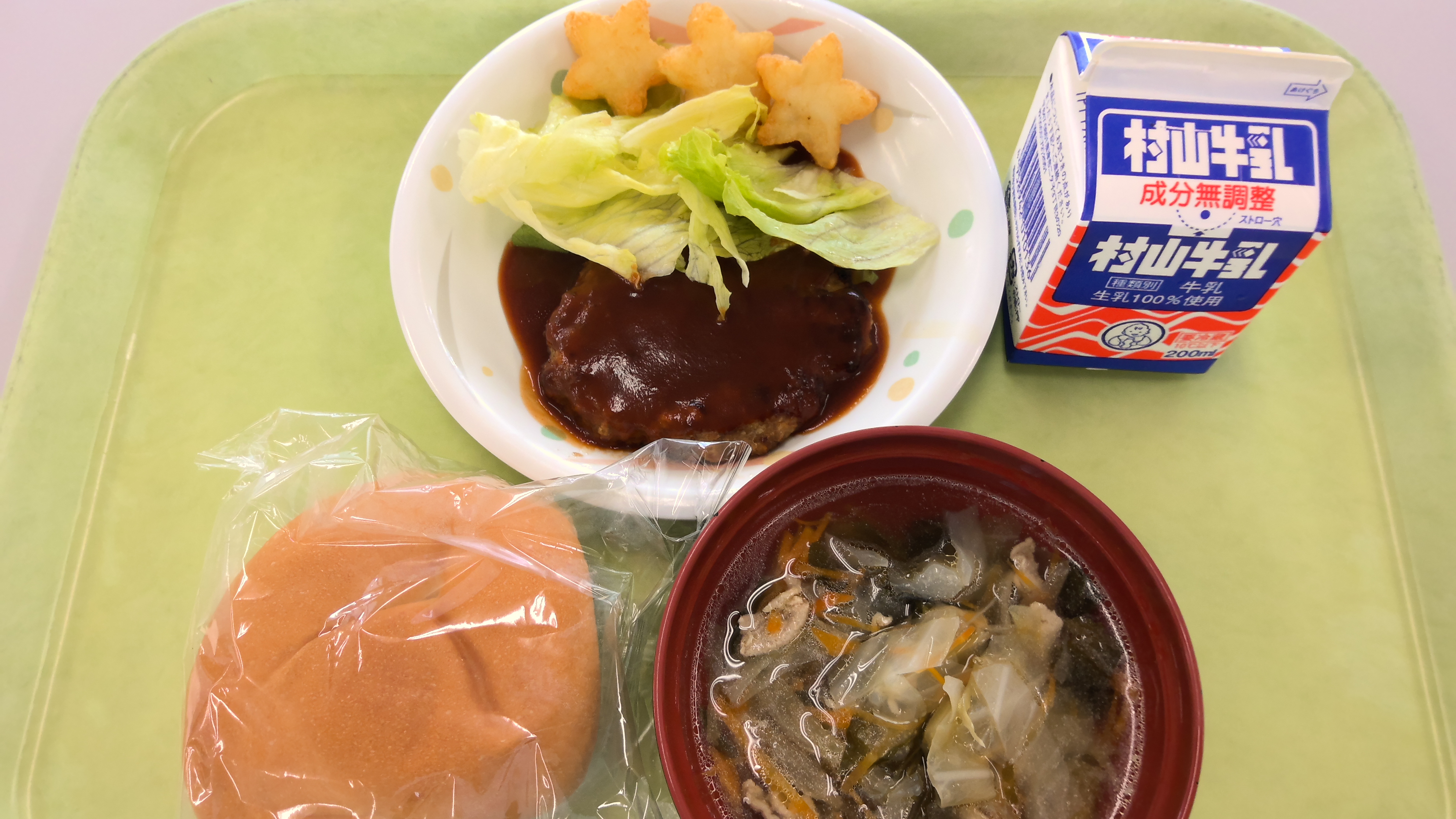 献立名:セルフハンバーガー(丸形コッペパン・ハンバーグ・レタス)、牛乳、星形ポテト、野菜スープ